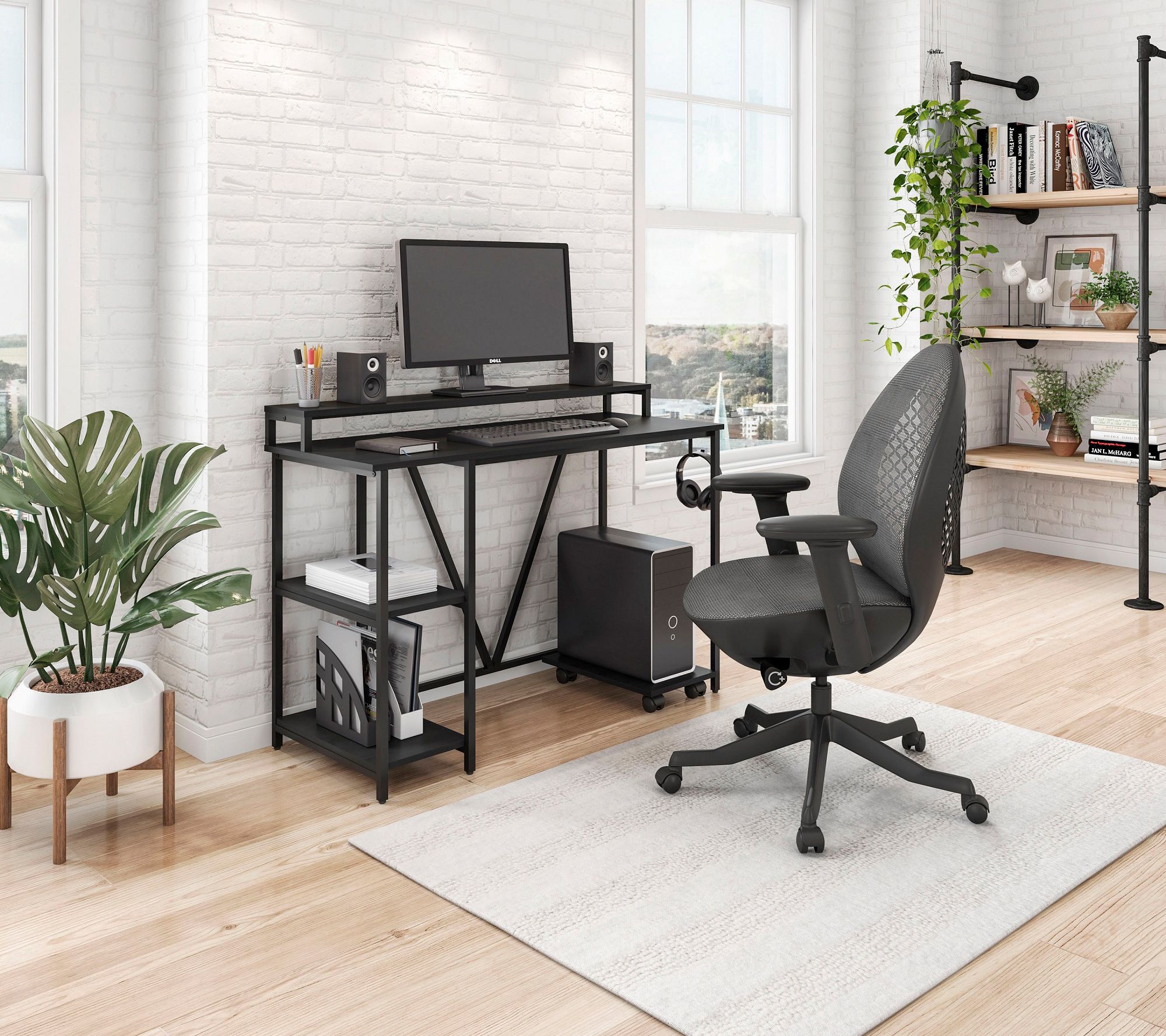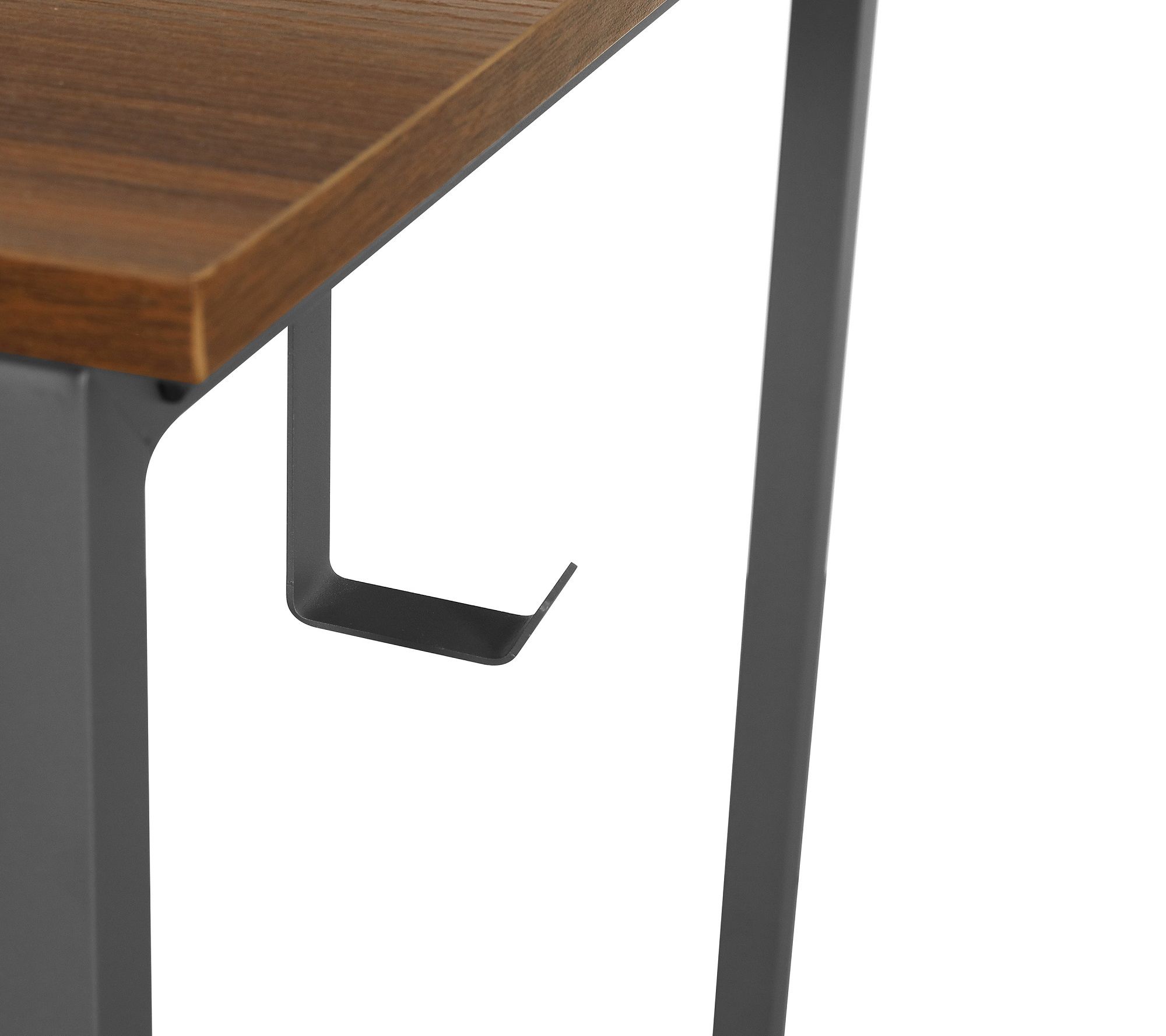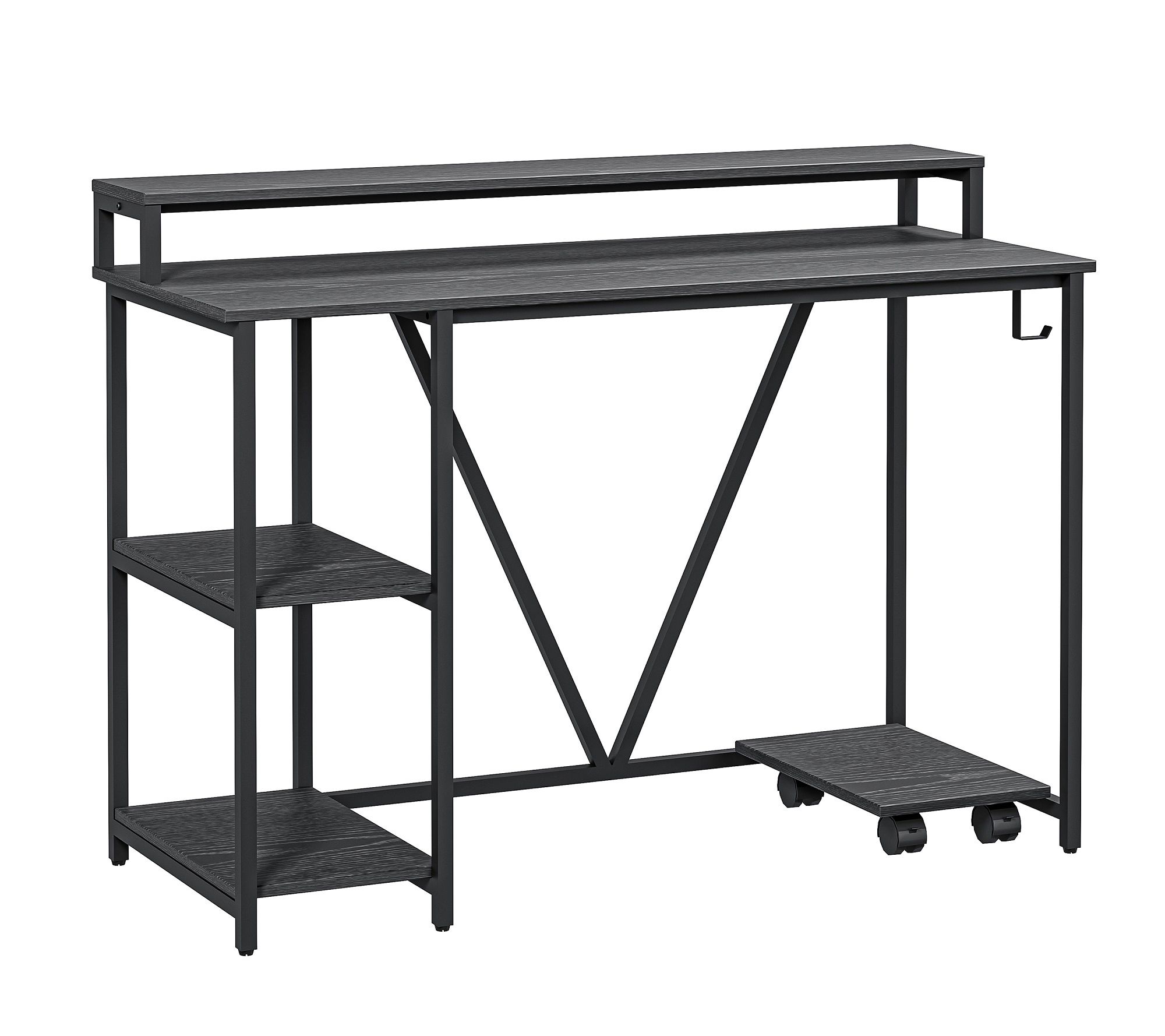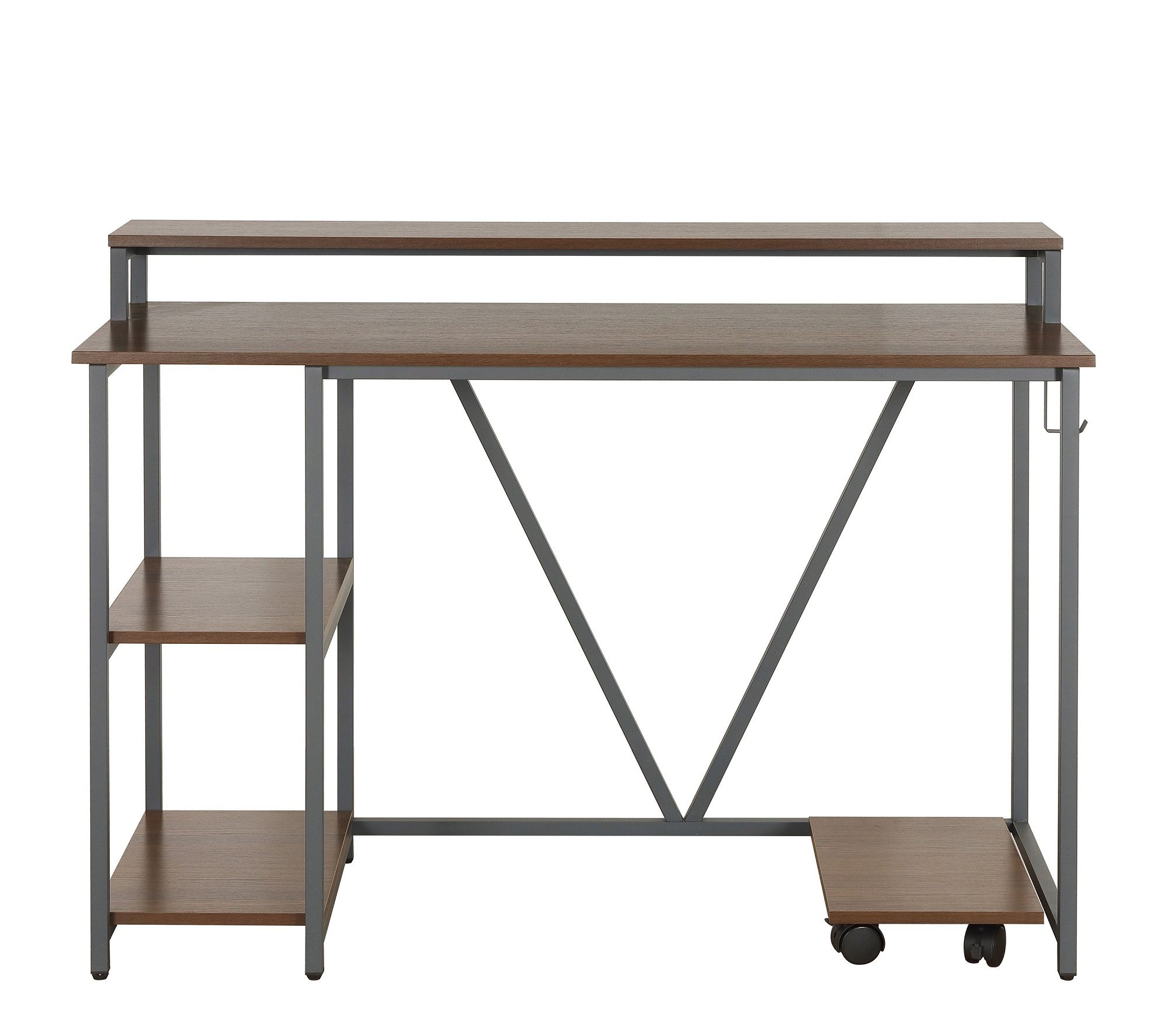 Featuring a clean-lined silhouette, two tiered open side storage, an elevated hutch-like shelf, a CPU caddy, and a small side hook to hold accessories, this sturdy desk is a great way to add function and cool industrial style to a home office. From