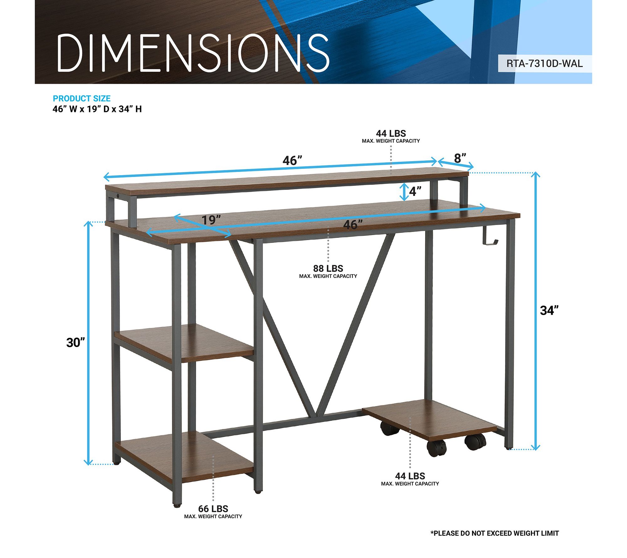 • Measures 46"W x 19"D x 34"H; Supports up to 88 lbs