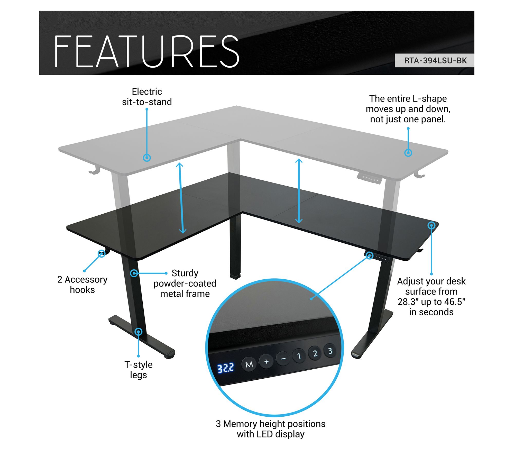 • Smooth electric height adjustment with three memory presets