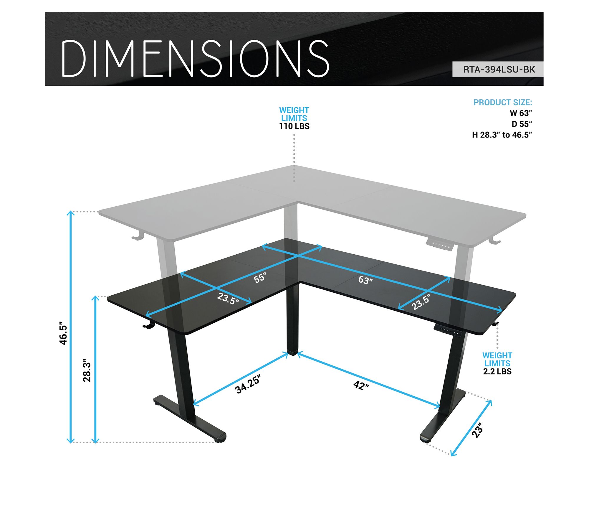 • Measures 63"W x 55"D x 28.3"–46.5"H; supports up to 110 lbs