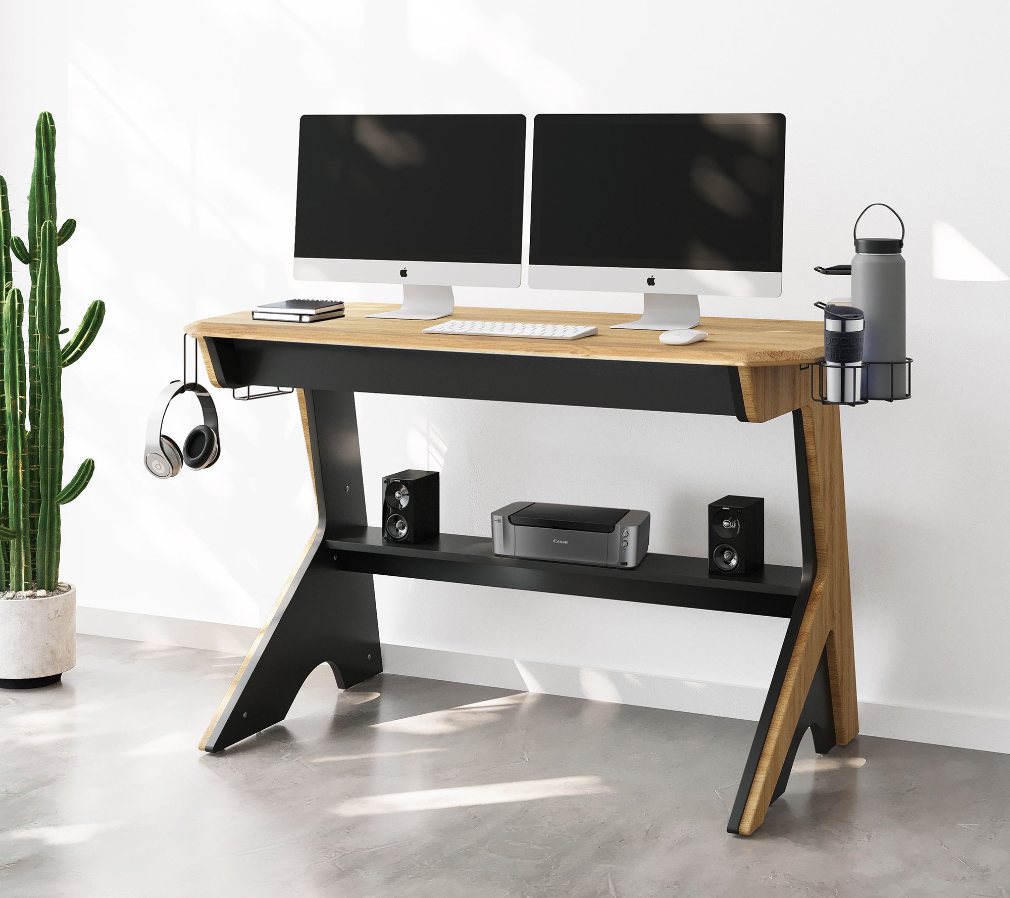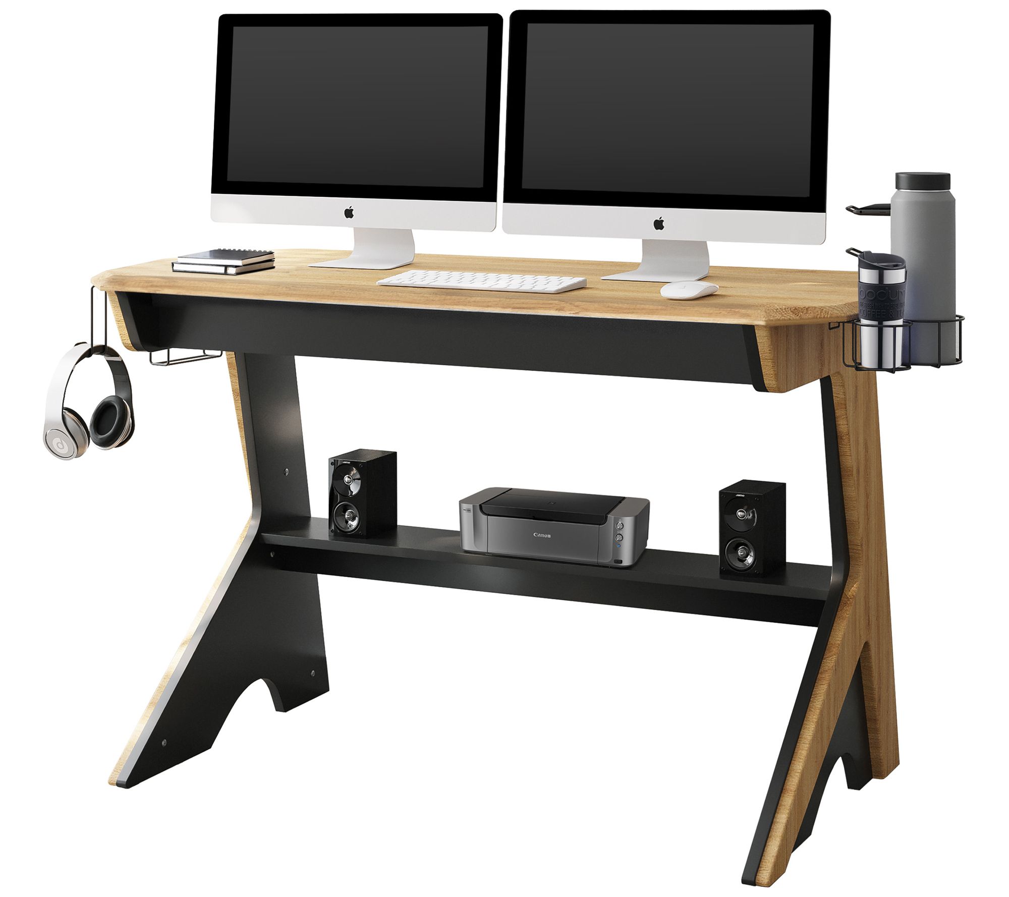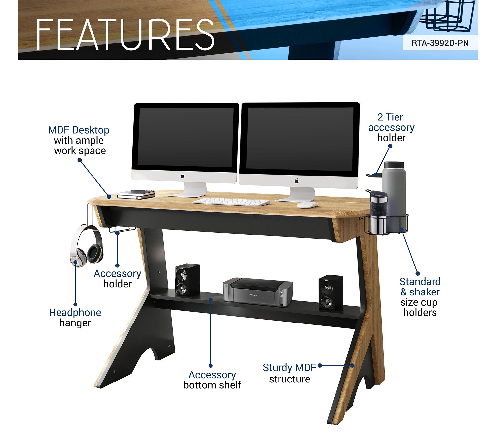 • Includes desk, assembly tools, two-tier accessory rack, accessory holder, standard and large cupholders, headphone holder, and instructions