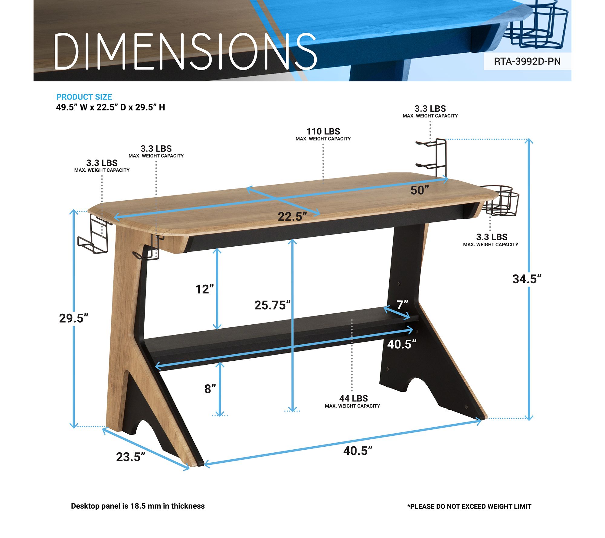 • Measures 49.5"W x 22"D x 29.5"H; 110-lb desktop weight capacity