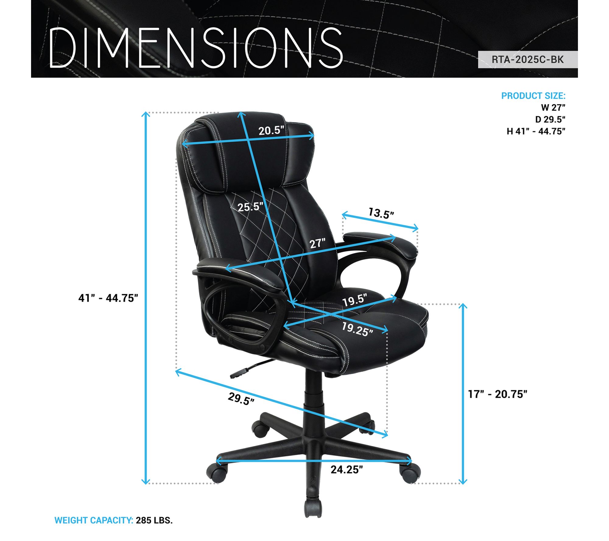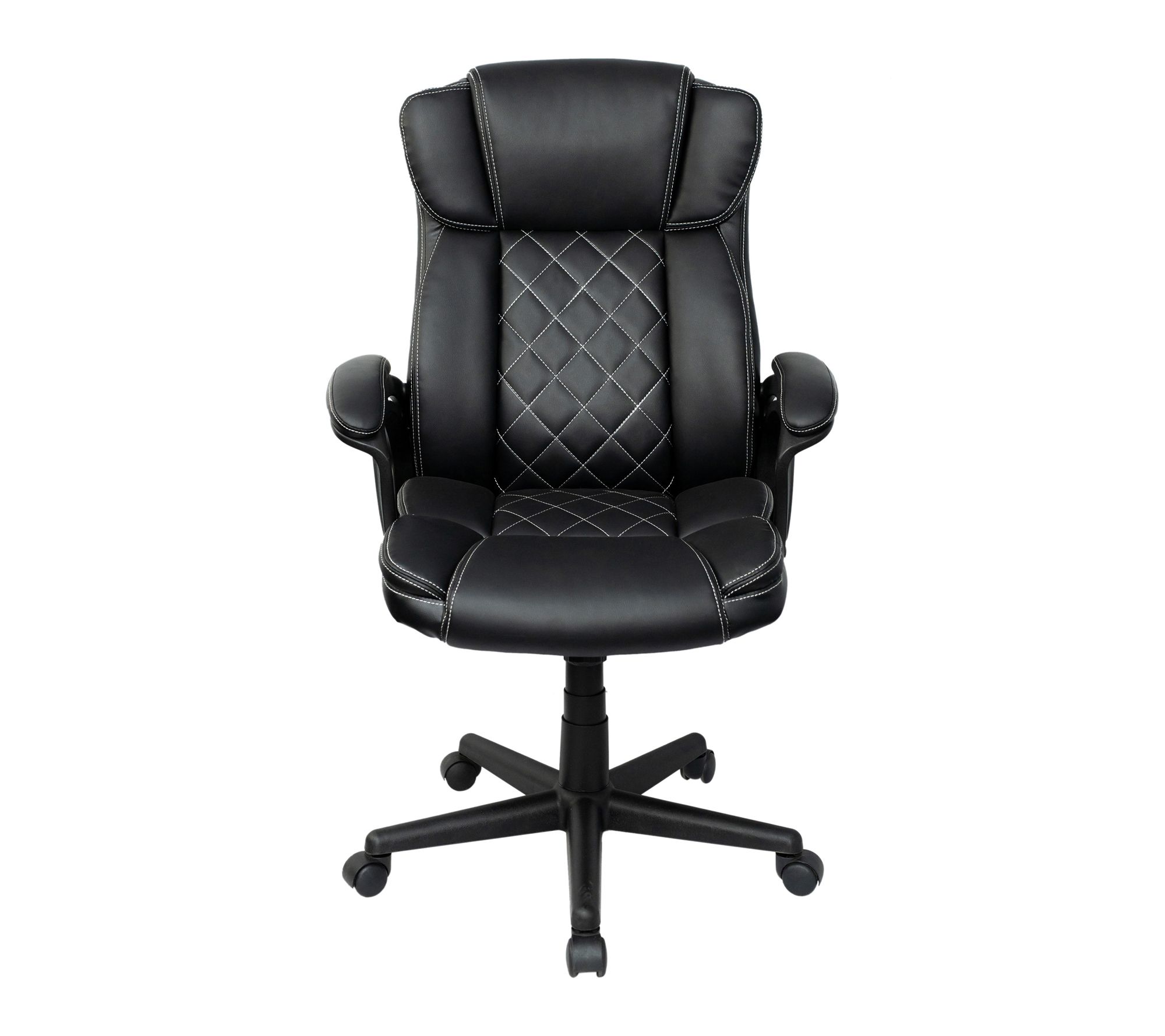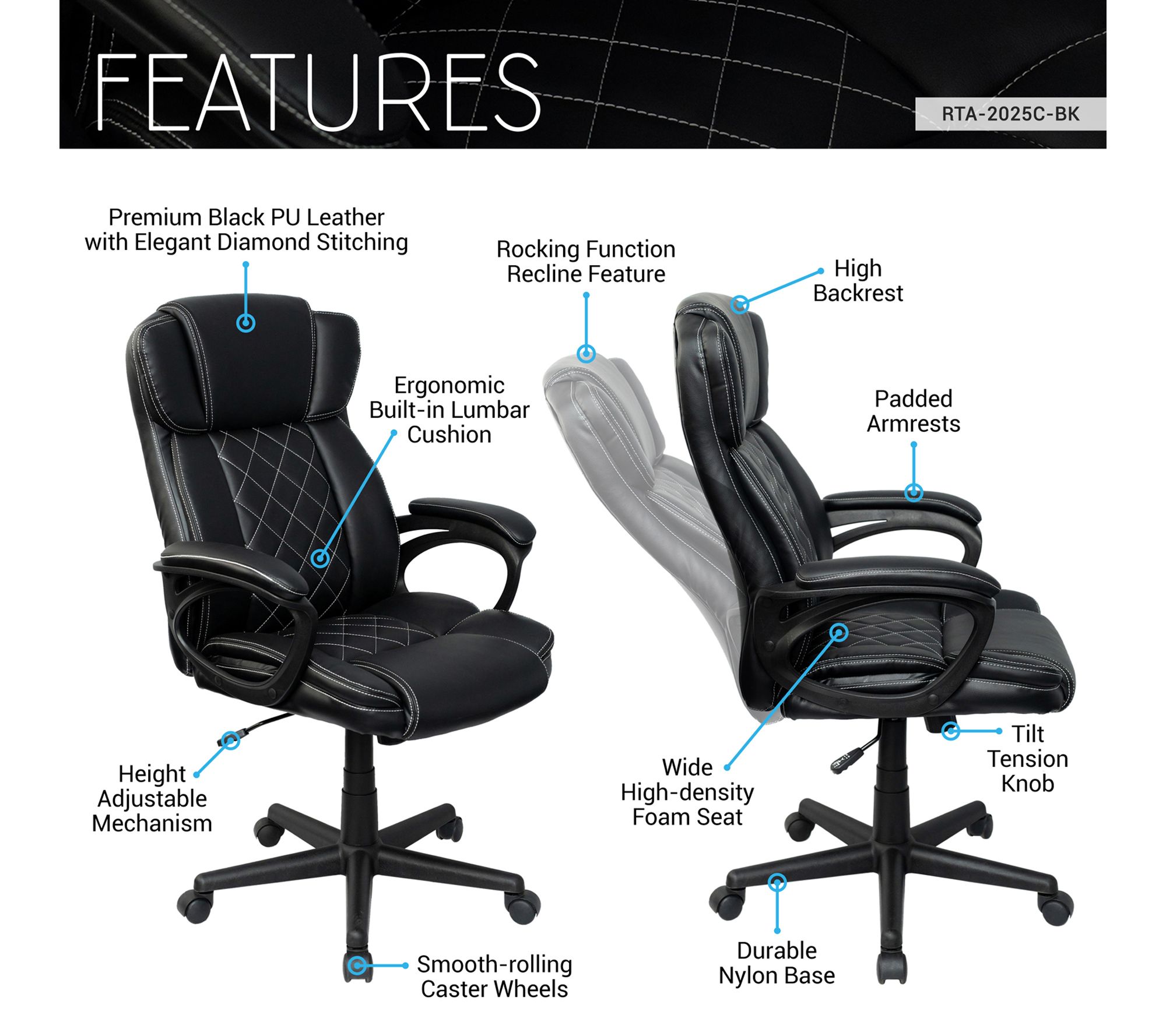 • Adjustable seat height; tilt-recline function; high back with head and lumbar support; thick padded seat and armrests; diamond-stitched faux leather; heavy-duty five-star base; smooth-rolling casters