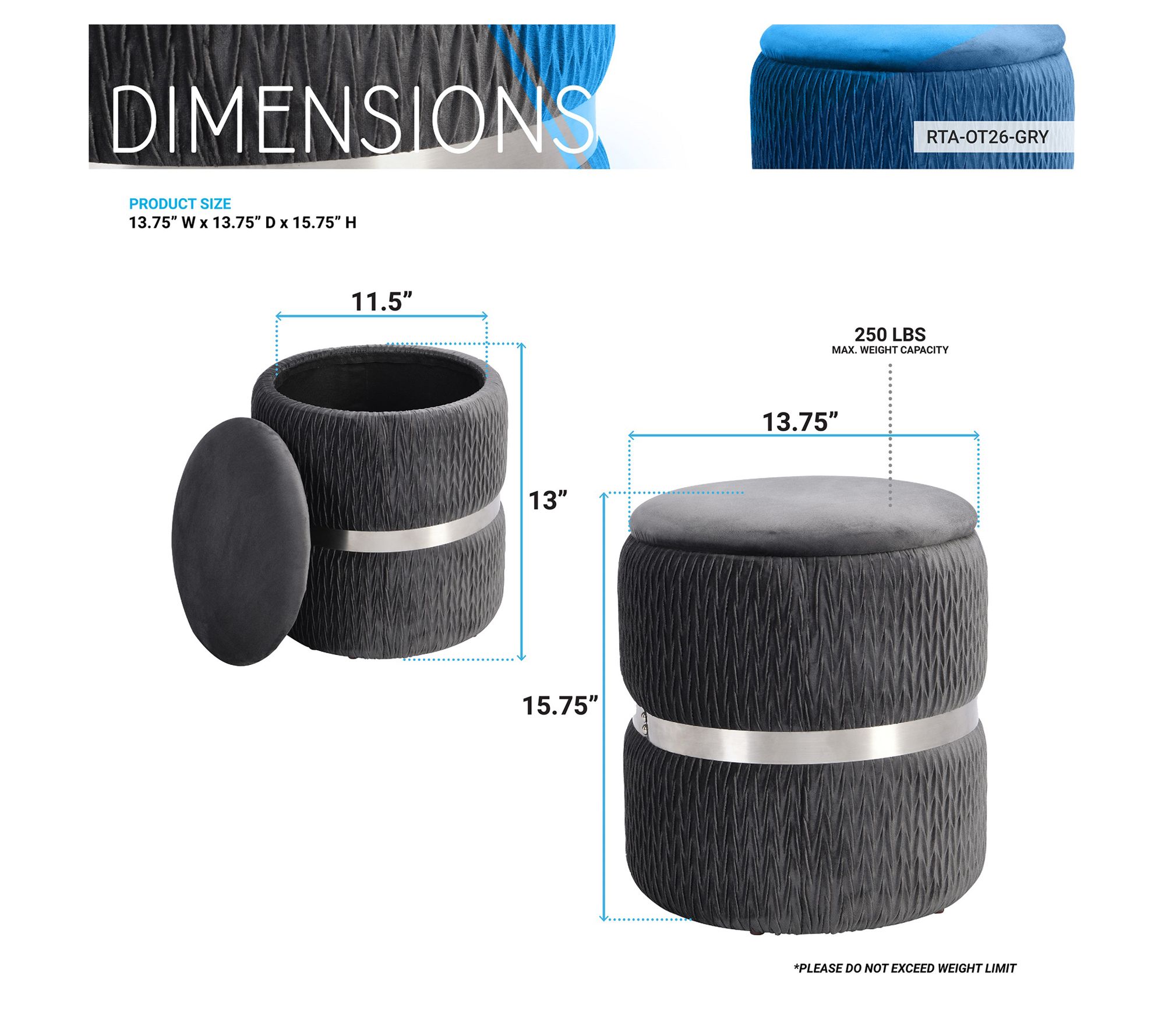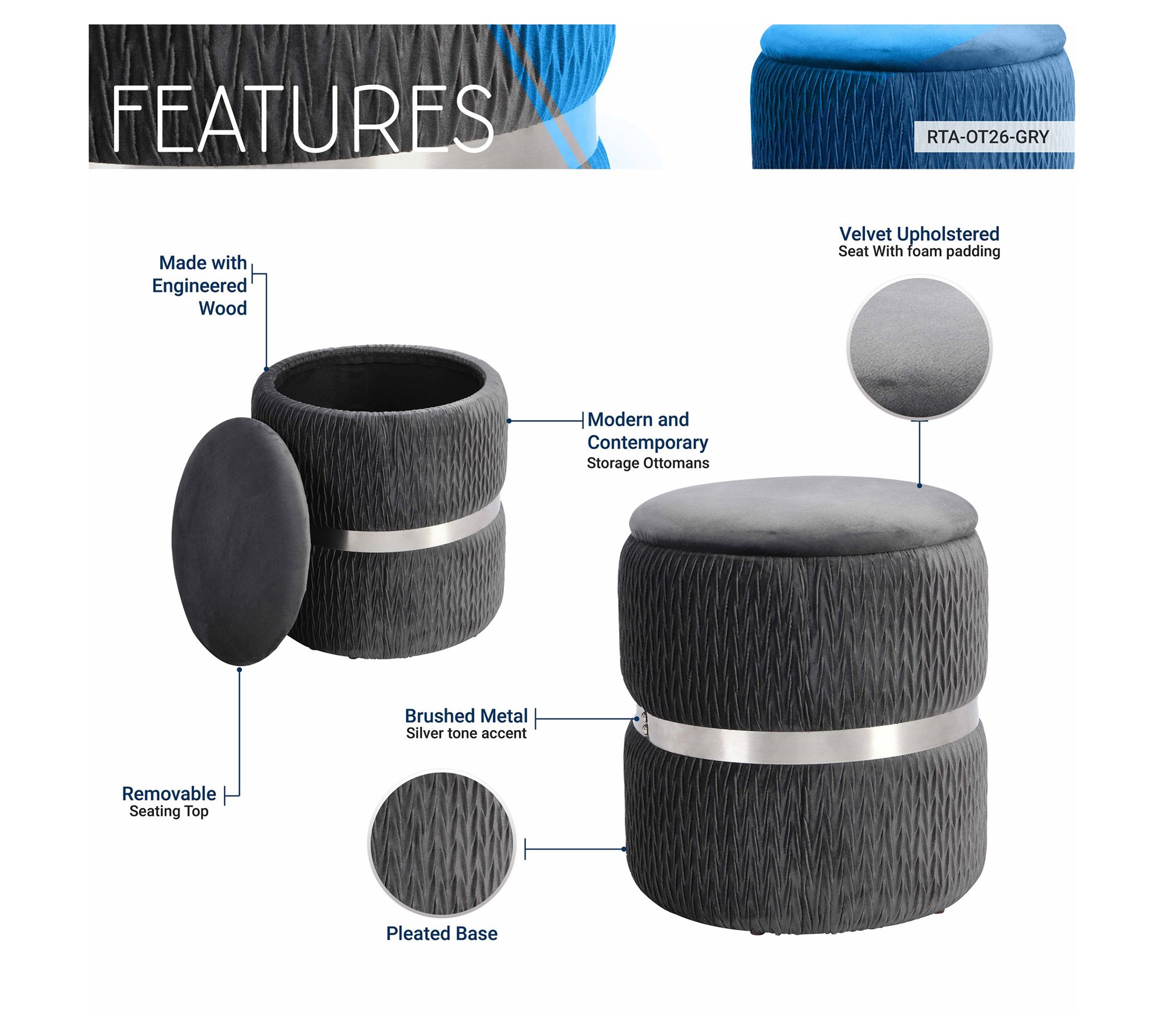 Techni Mobili Gray Velvet Round Ottoman with St orage