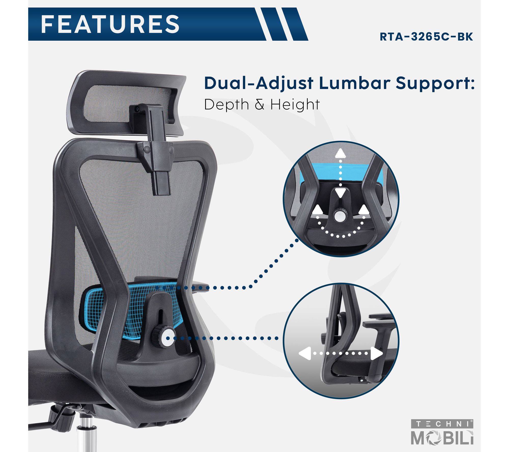 Experience the ultimate in comfort and productivity with the Techni Mobili mesh truly ergonomic high back office chair. Designed with a breathable mesh back and contoured seat cushion, this chair promotes healthy posture with adjustable lumbar support and headrest. From Techni Mobili.
