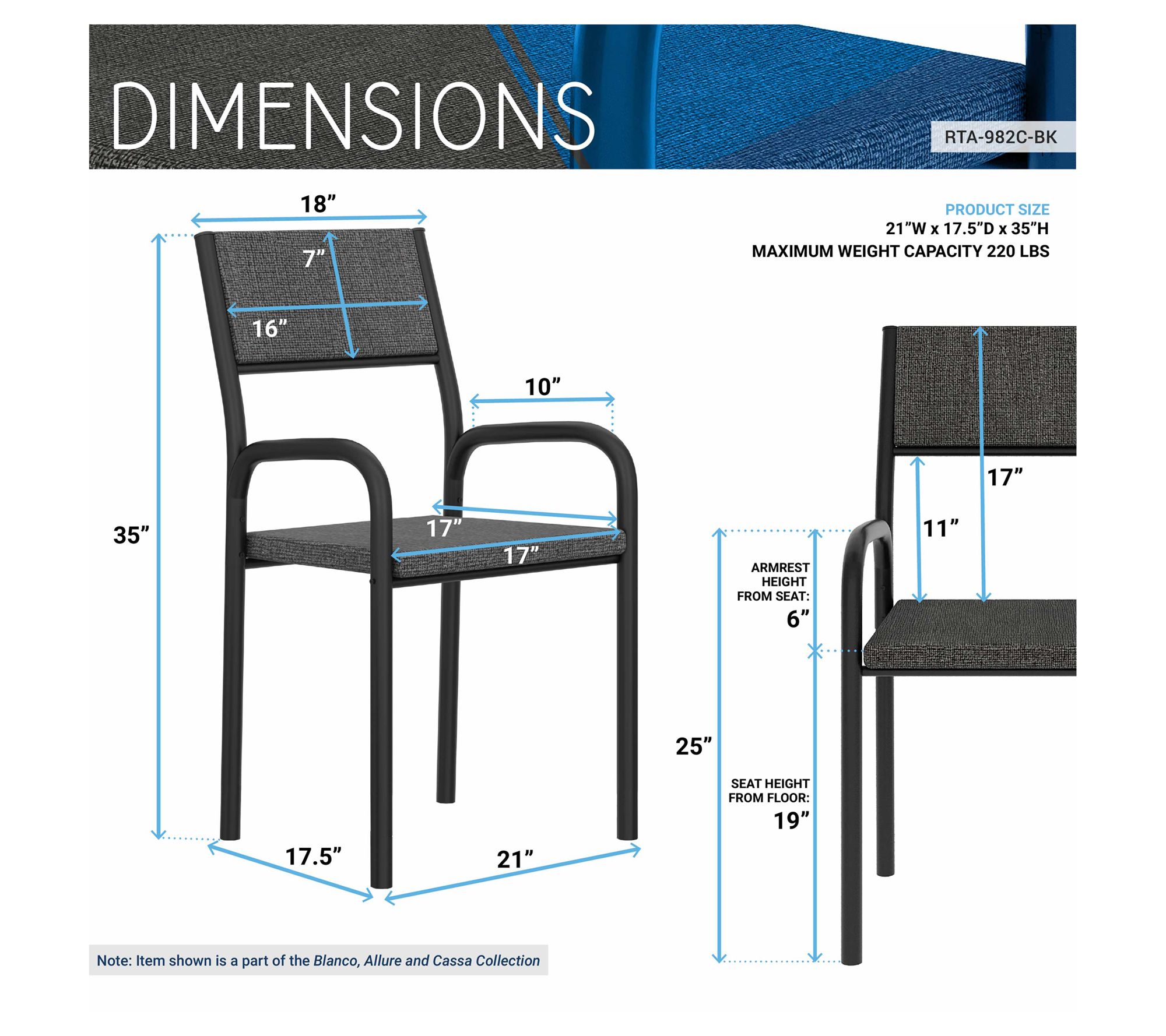• Measures approximately 20"W x 17"D x 35"H, supports up to 220 lbs