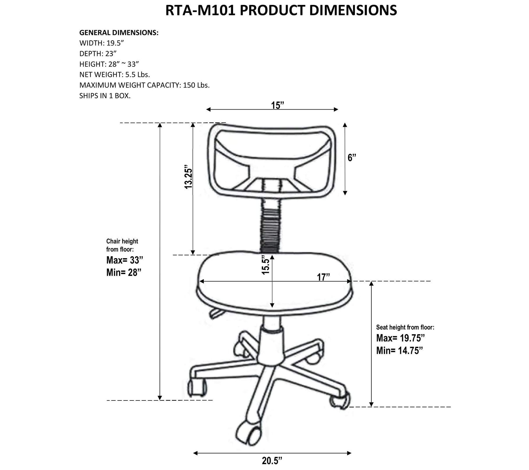• Measures 19.5"W x 23"D x 28"H to 33"H; 150-lb weight capacity