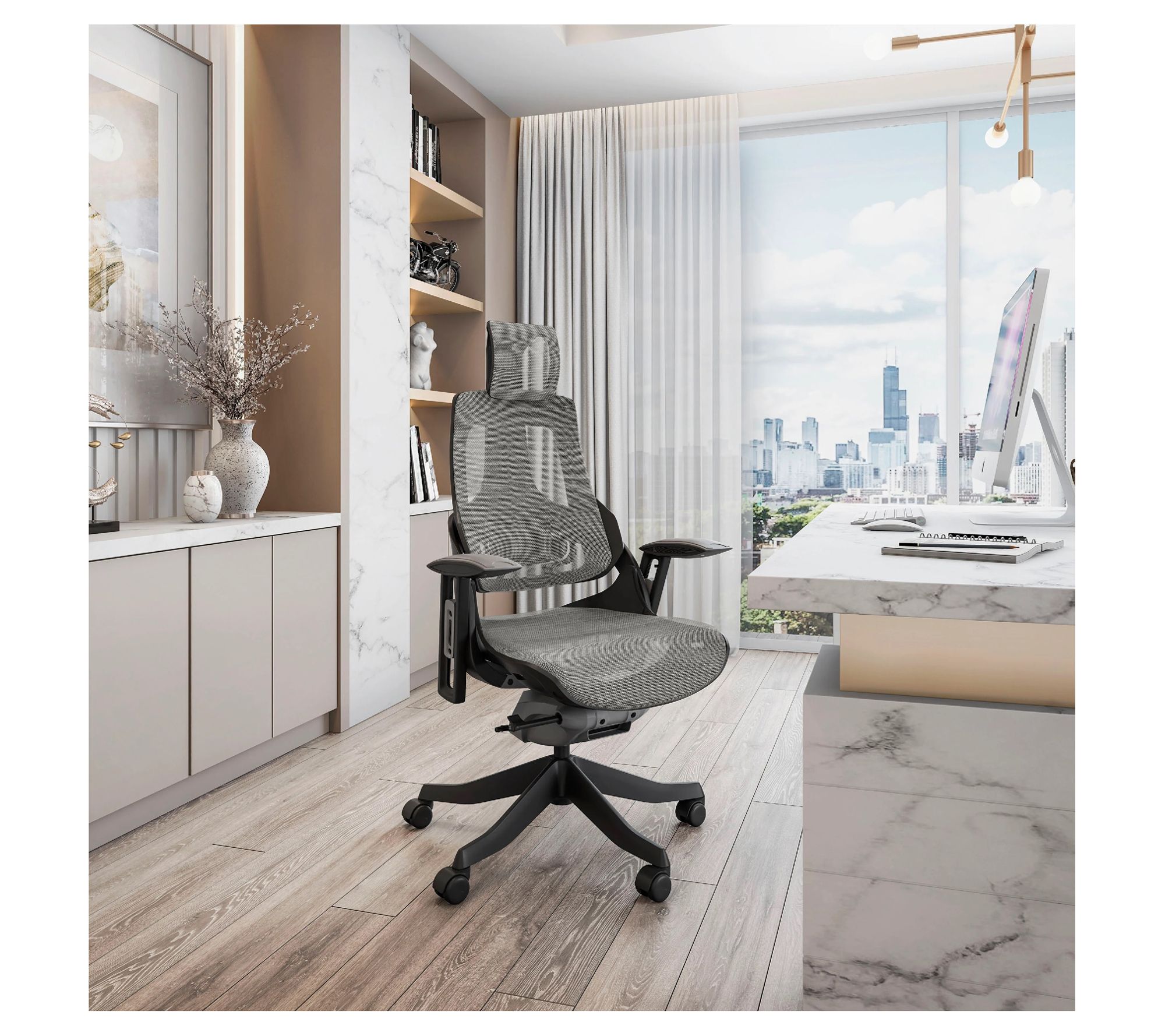 Featuring height-adjustable arms, a mesh back, and a contoured seat cushion, this chair ensures you stay cool and supported throughout your workday. The five precision adjustment points (including customizable height, headrest, armrests, tilt control, and lumbar support) make this chair a must-have for any office. From Techni Mobili.