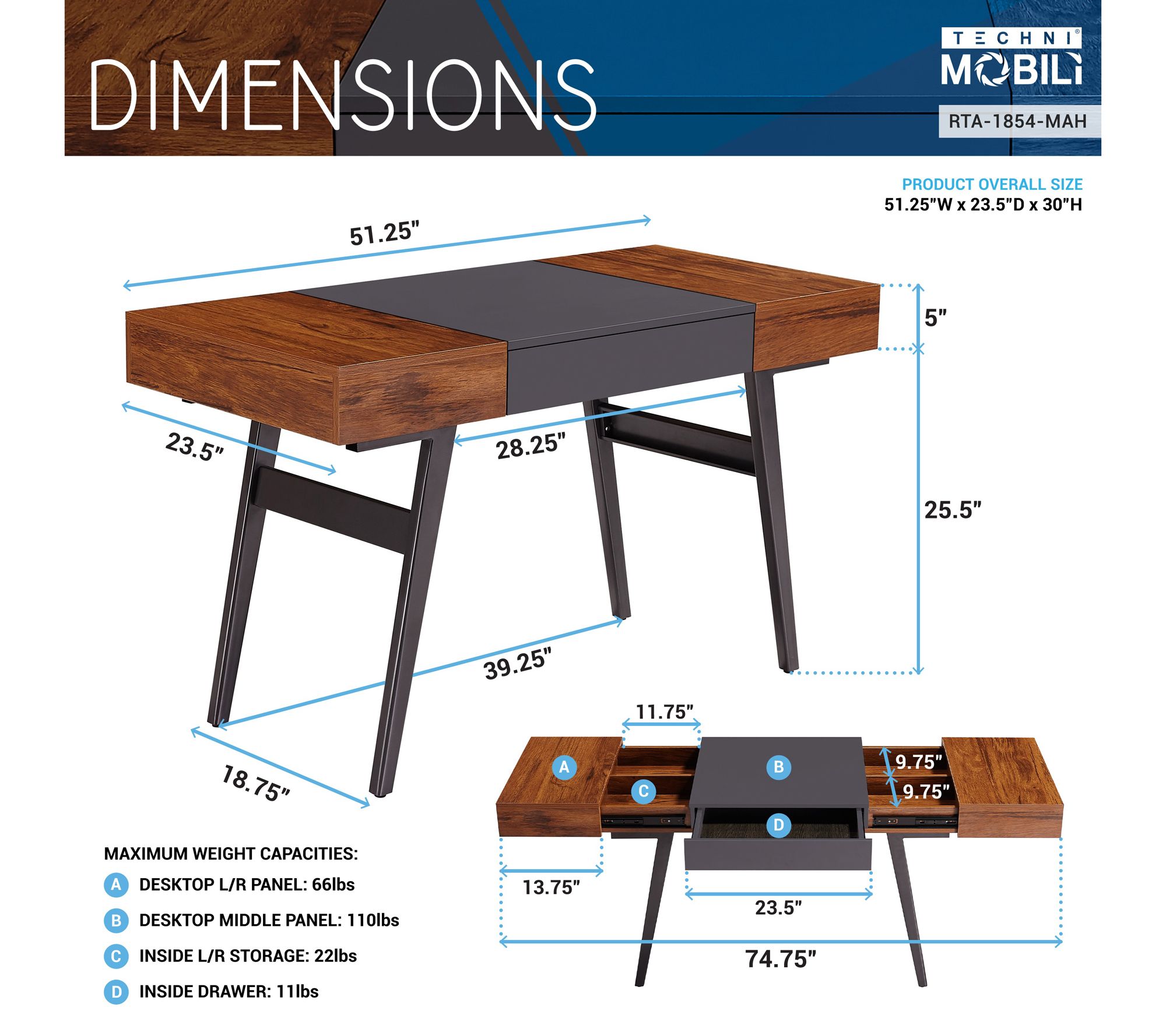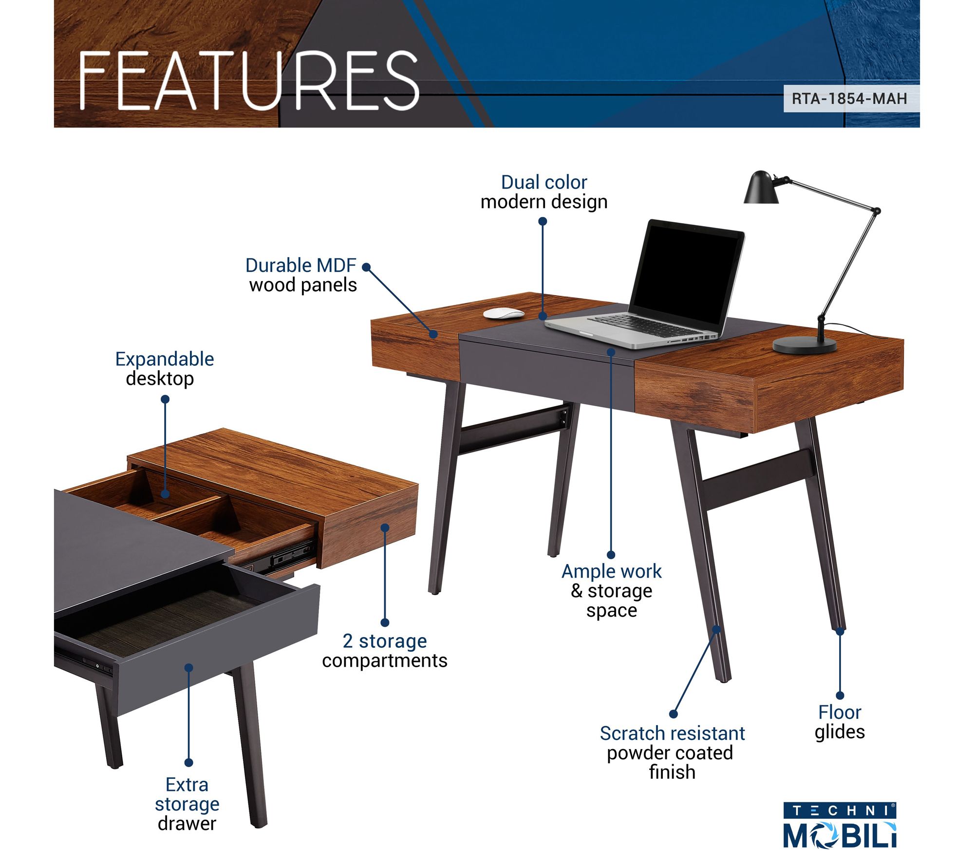 Techni Mobili Writing Desk Dual Side & Pull-Out Front Drawer