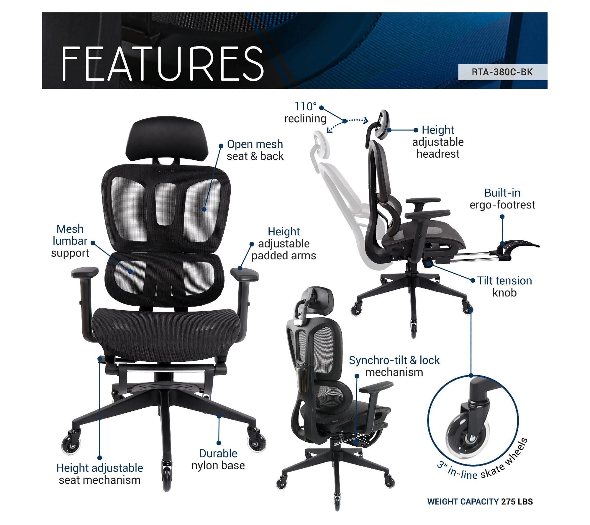 • 110-degree reclining synchro-tilt and lock mechanism