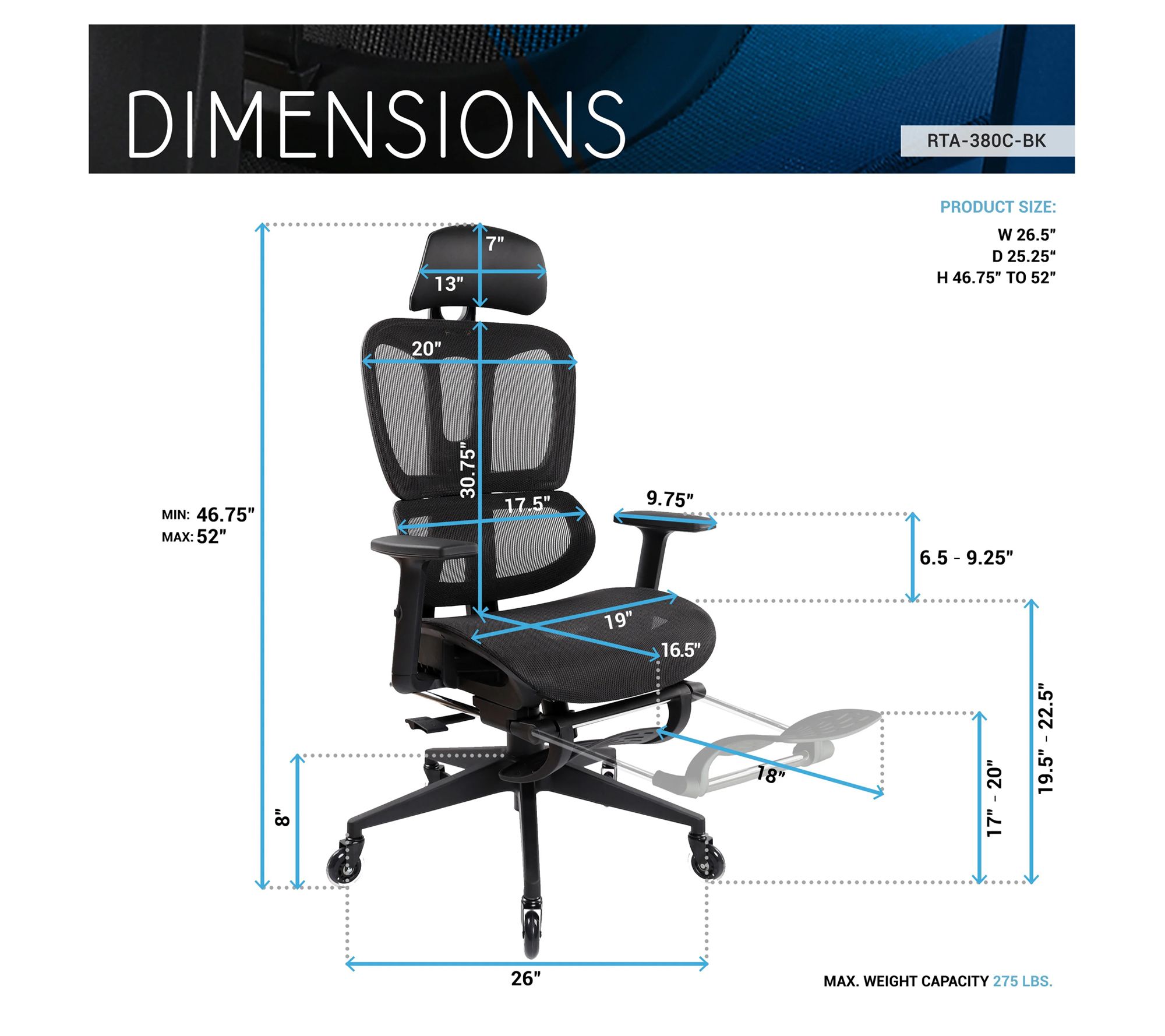 • Measures 26.5"W x 25.25"D x 46.75-52"H; supports up to 275 lbs