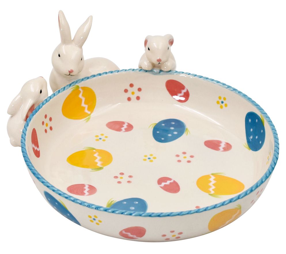 A sweet trio of bunnies accent this fun and colorful bowl that's decorated inside and out with the cheerful Egghunt pattern. From Temp-tations®.