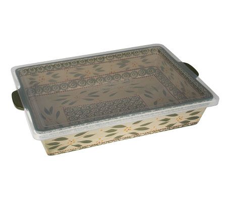 Everything you already love about Temp-tations(R) Bakeware--the beauty, the convenience, and the portability--are offered here, in this charming and functional 9x13 Lid-it Baker. Prep, cook, serve, and store mouthwatering meals in this handpainted ceramic baker, artfully designed in your choice of two of our most popular motifs, Old World and Polka Dot.