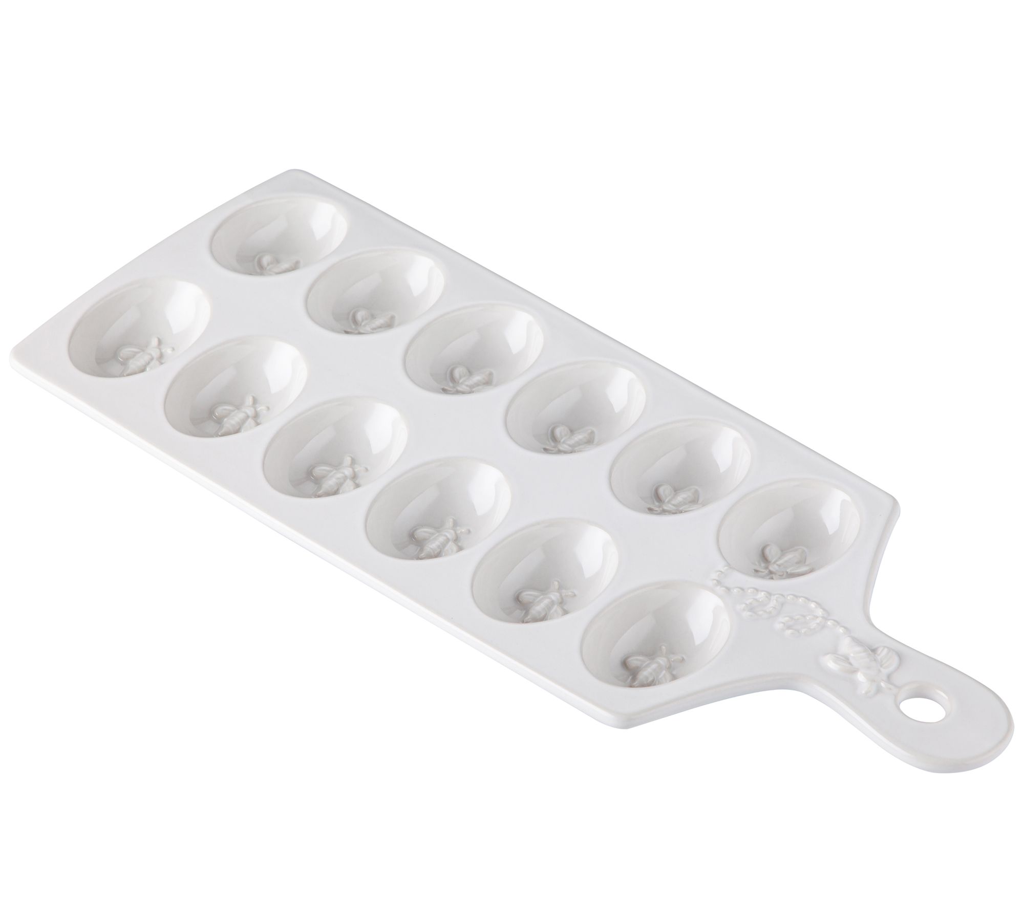 Are your deliciously delightful deviled eggs on the menu? Serve 'em up in style with this 12-count egg tray that features a handle for easy hosting! From Temp-tations®.