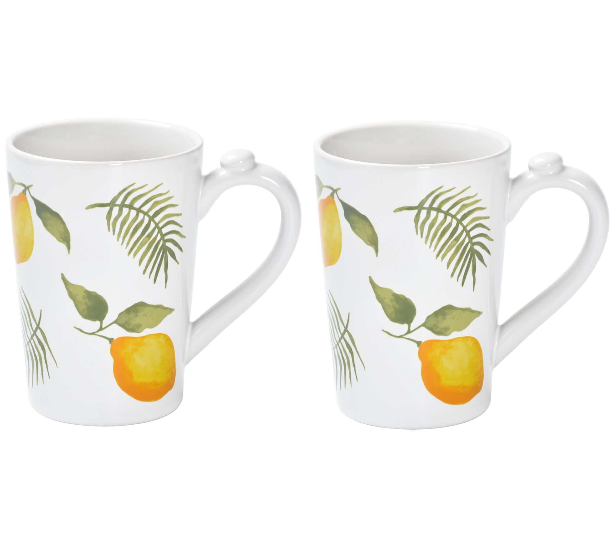 Brighten up your afternoon tea or morning coffee with this pair of ceramic stoneware mugs, each featuring a fun design accented by a figural thumb rest on the handle. From Temp-tations®.