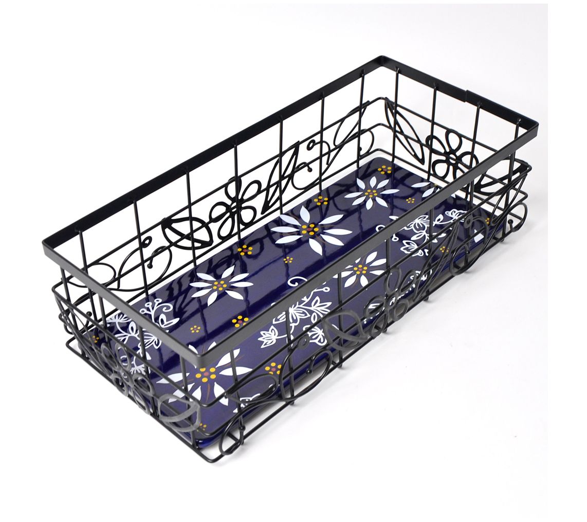 Includes metal wire basket and ceramic trivet