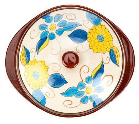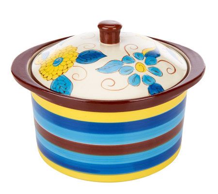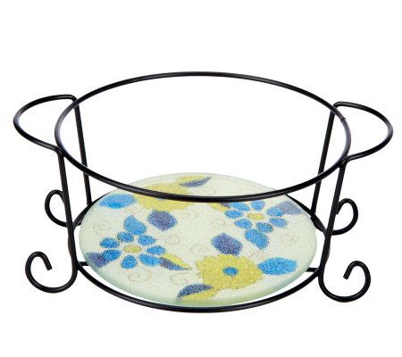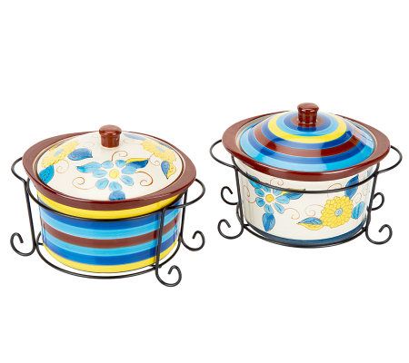 These round bakers complement any decor with modern floral patterns handpainted in lovely colors. Wire racks make them perfect for table presentation. From Temp-tations(R) Ovenware.