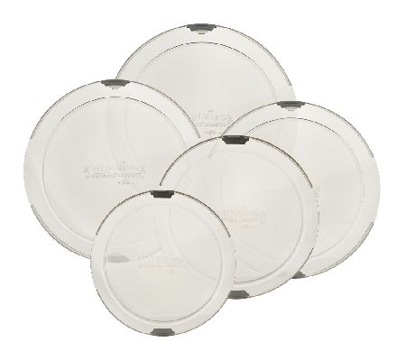 Includes 2.5-qt round baker with Lid-It, plastic storage cover, and wire rack; 2-qt round baker with Lid-It, plastic storage cover, and wire rack; 1.5-qt round baker with Lid-It, plastic storage cover, and wire rack; 1.5-qt round bowl with Lid-It and plastic storage cover; and 1-qt round bowl with Lid-It and plastic storage cover