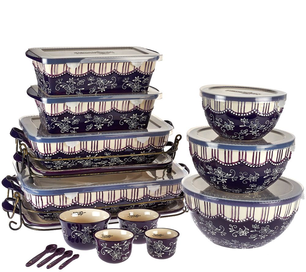 Includes 13x9 4-qt ceramic baker with Lid-It and wire rack, 11x7 2-1/2-qt ceramic baker with Lid-It and wire rack, two 1-3/4-qt ceramic loaf pans, one 3-qt bowl, one 2-qt bowl, one 1-qt bowl, 1-cup measuring cup, 1/2-cup measuring cup, 1/3-cup measuring cup, 1/4-cup measuring cup, four measuring spoons, a set of 10 recipe cards, and seven plastic storage covers