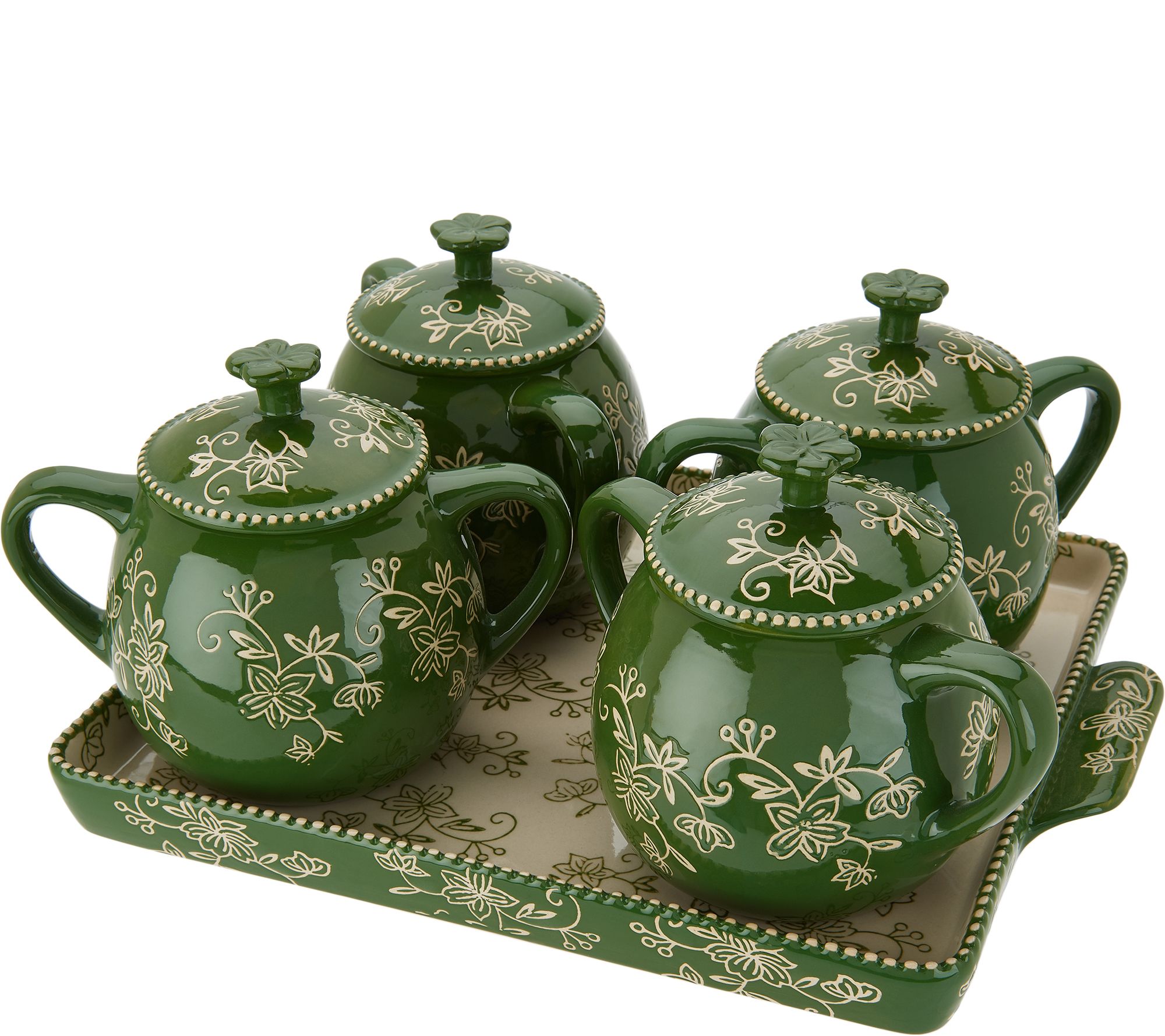 Includes four 16-oz soup crocks, four lids, and serving tray