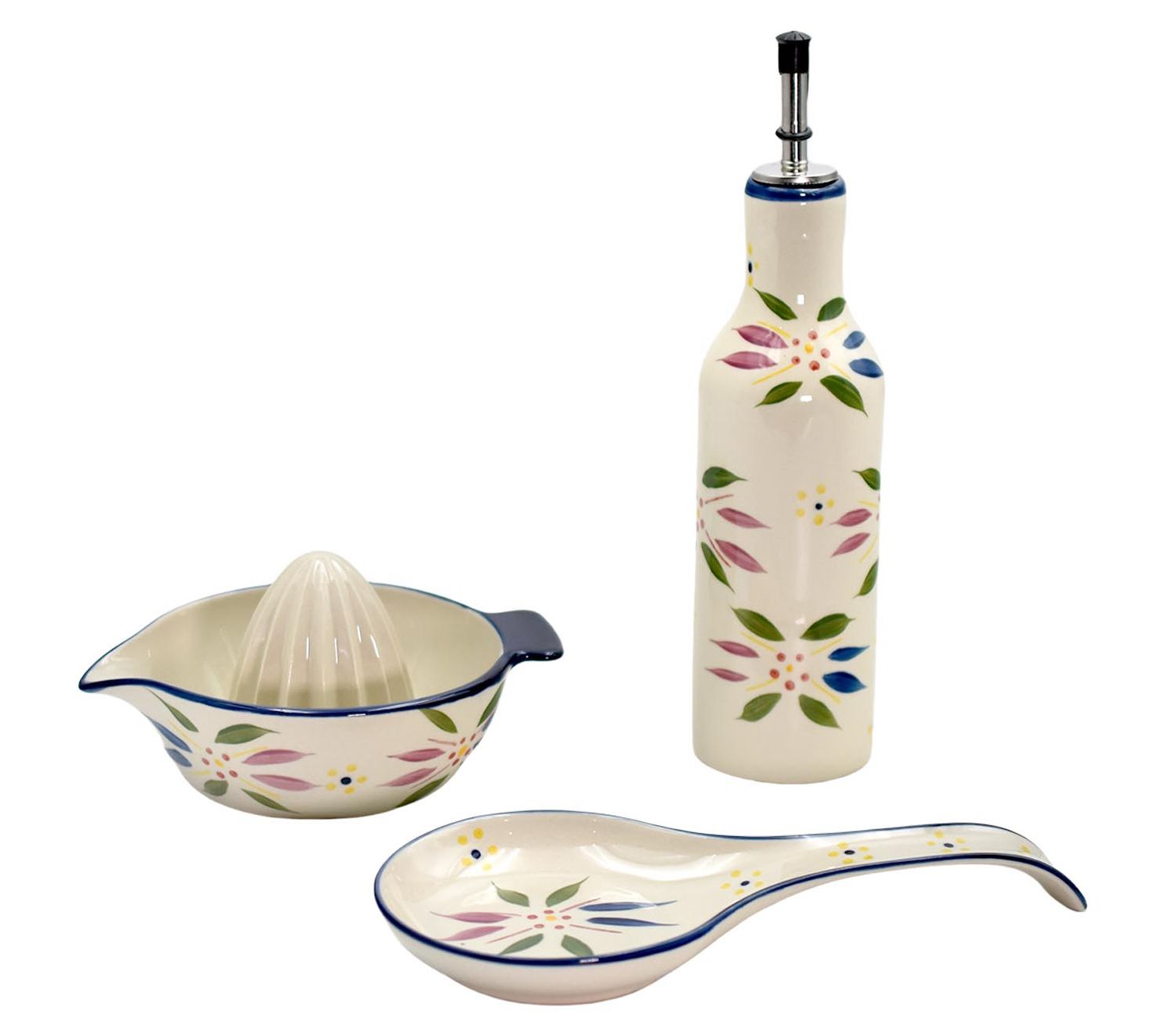 Brighten your kitchen tasks with this three-piece accessory set -- complete with a cruet for your favorite oils, a spoon rest to keep counters clean, and a juicer to add fresh flavors to your dishes. From Temp-tations® Ovenware.