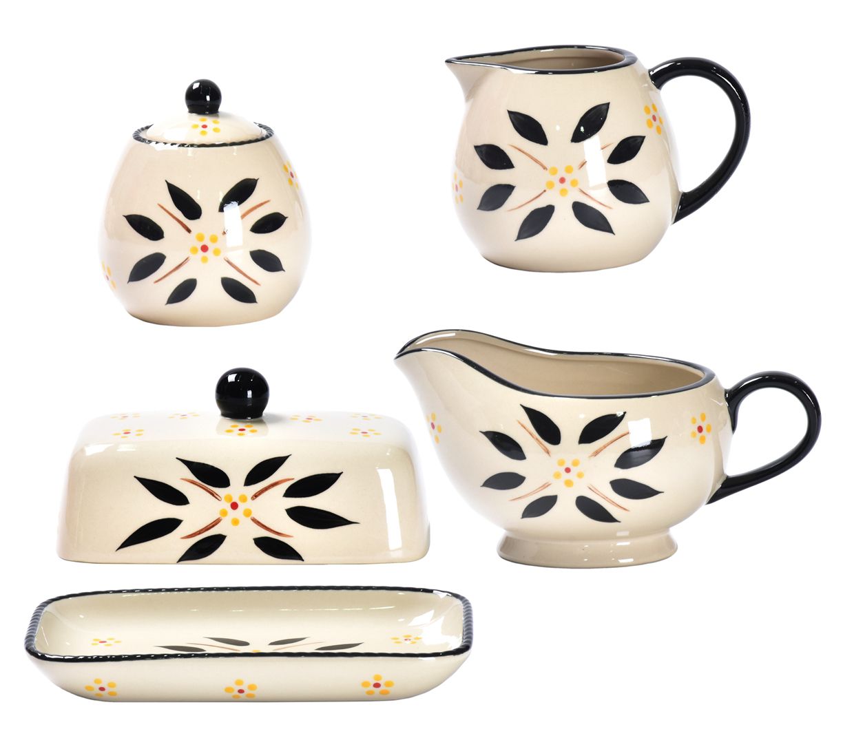 Includes 10-oz creamer, 10-oz sugar bowl with lid, 14-oz gravy boat, and butter dish with lid