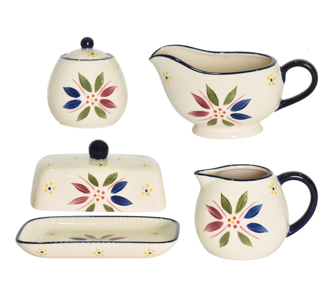 Includes 10-oz sugar bowl with lid, 10-oz creamer, 14-oz gravy boat, and butter dish with lid