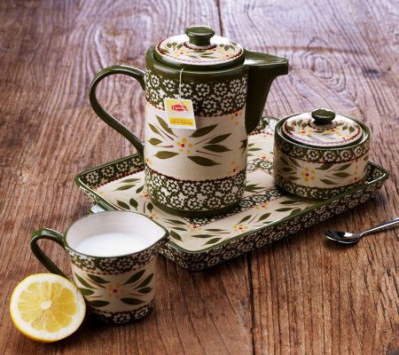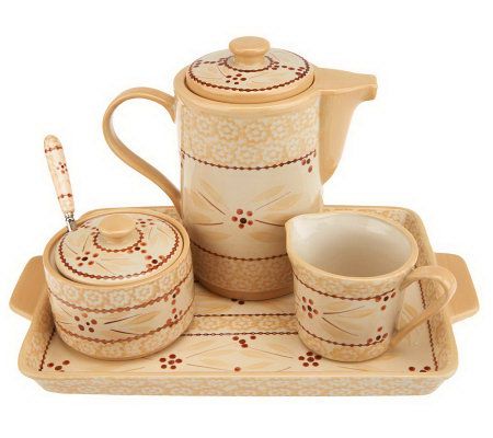 Sweet tea. Sweeten your tea service with this four-piece set. A teapot, creamer, and sugar dish are corralled on a matching tray that makes tea for two--or more--a lovely occasion. From Temp-tations(R) Ovenware.
