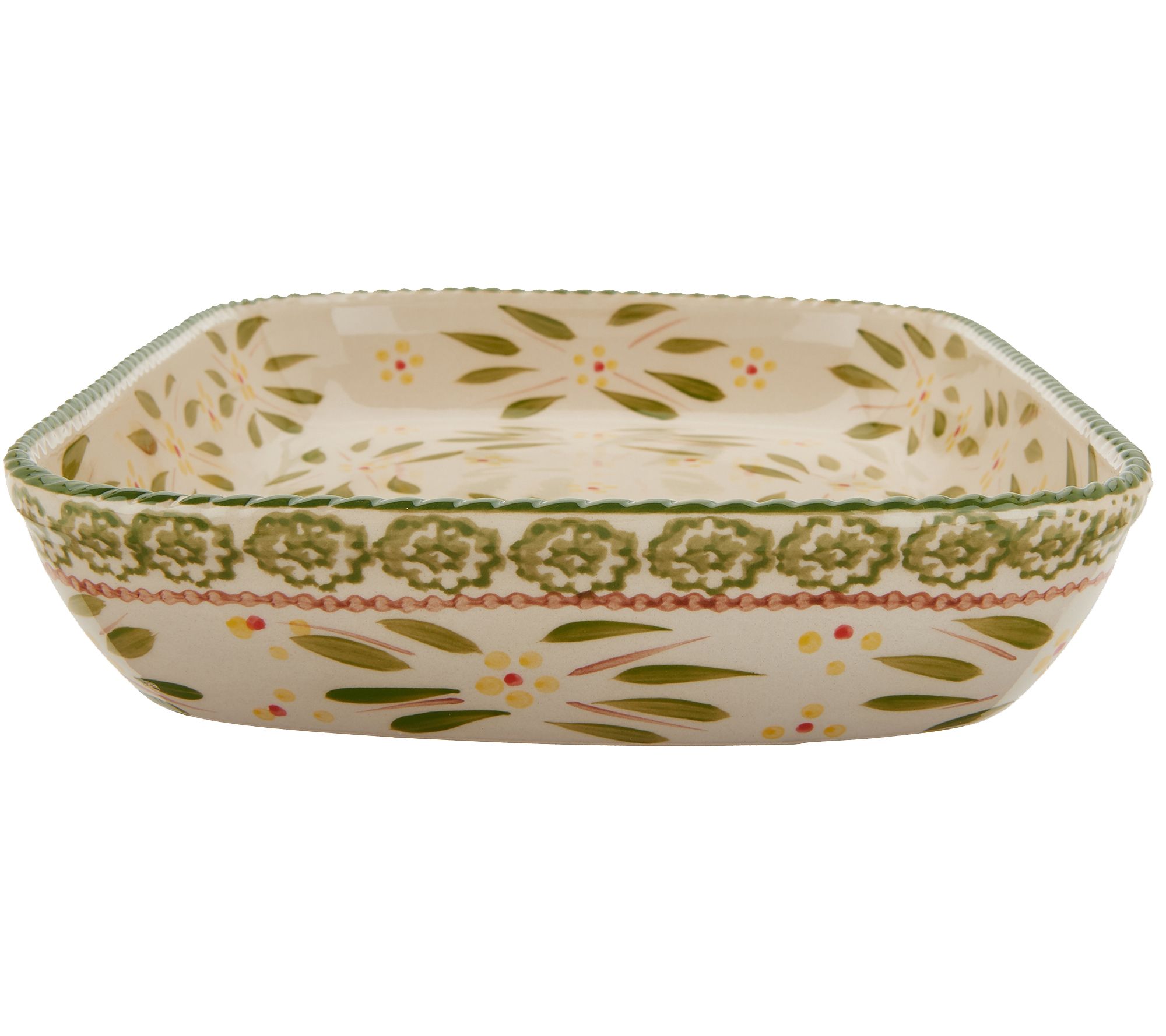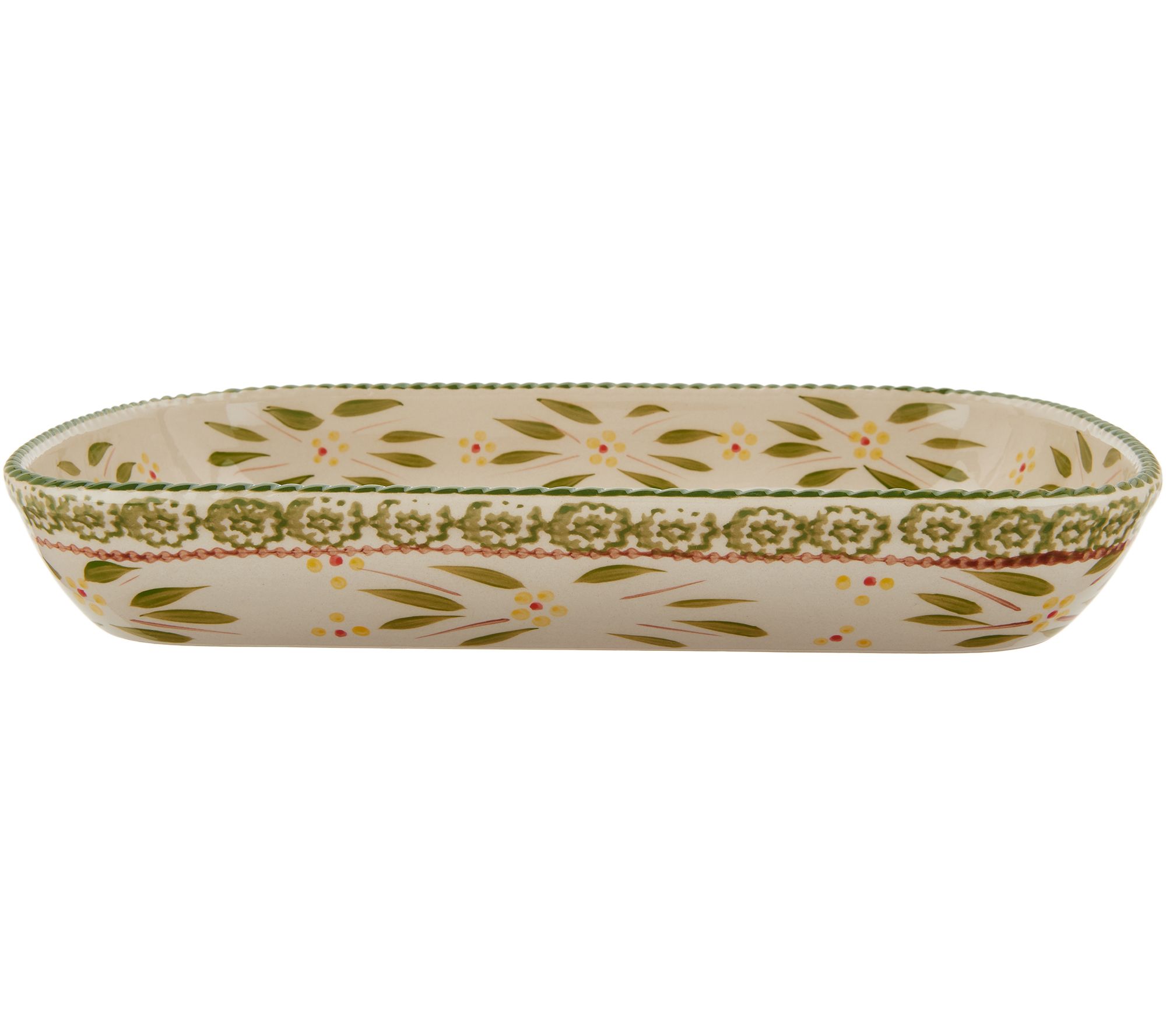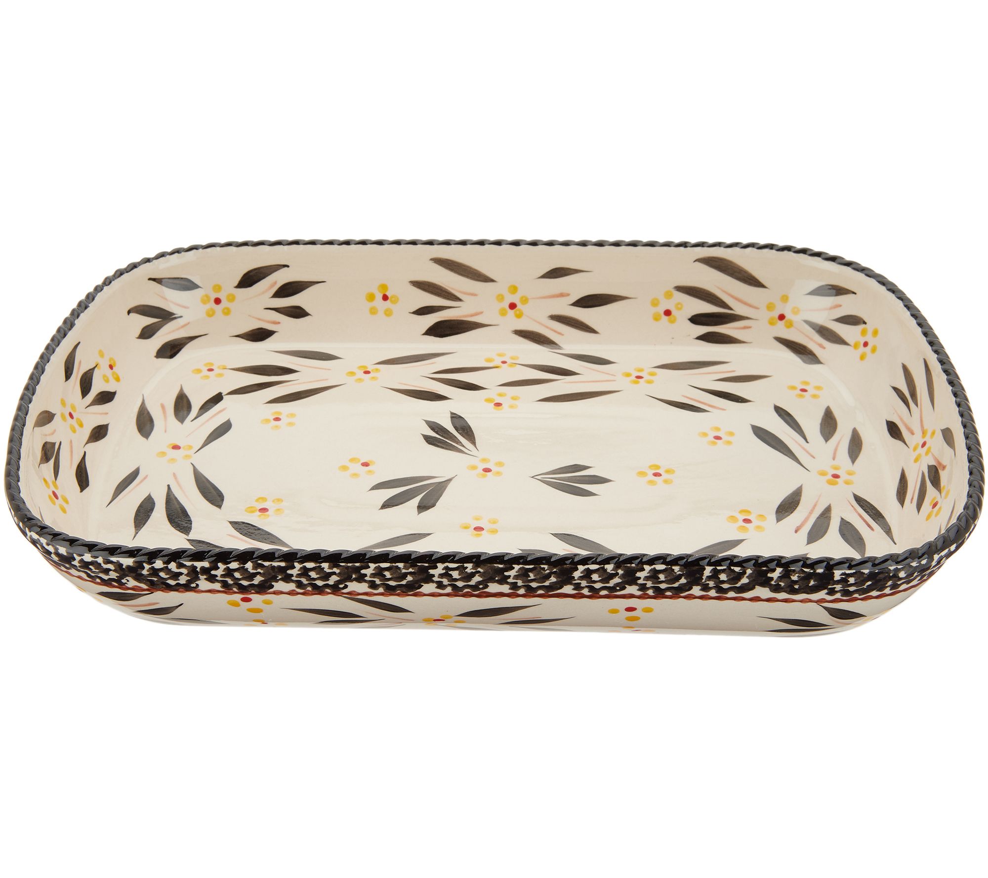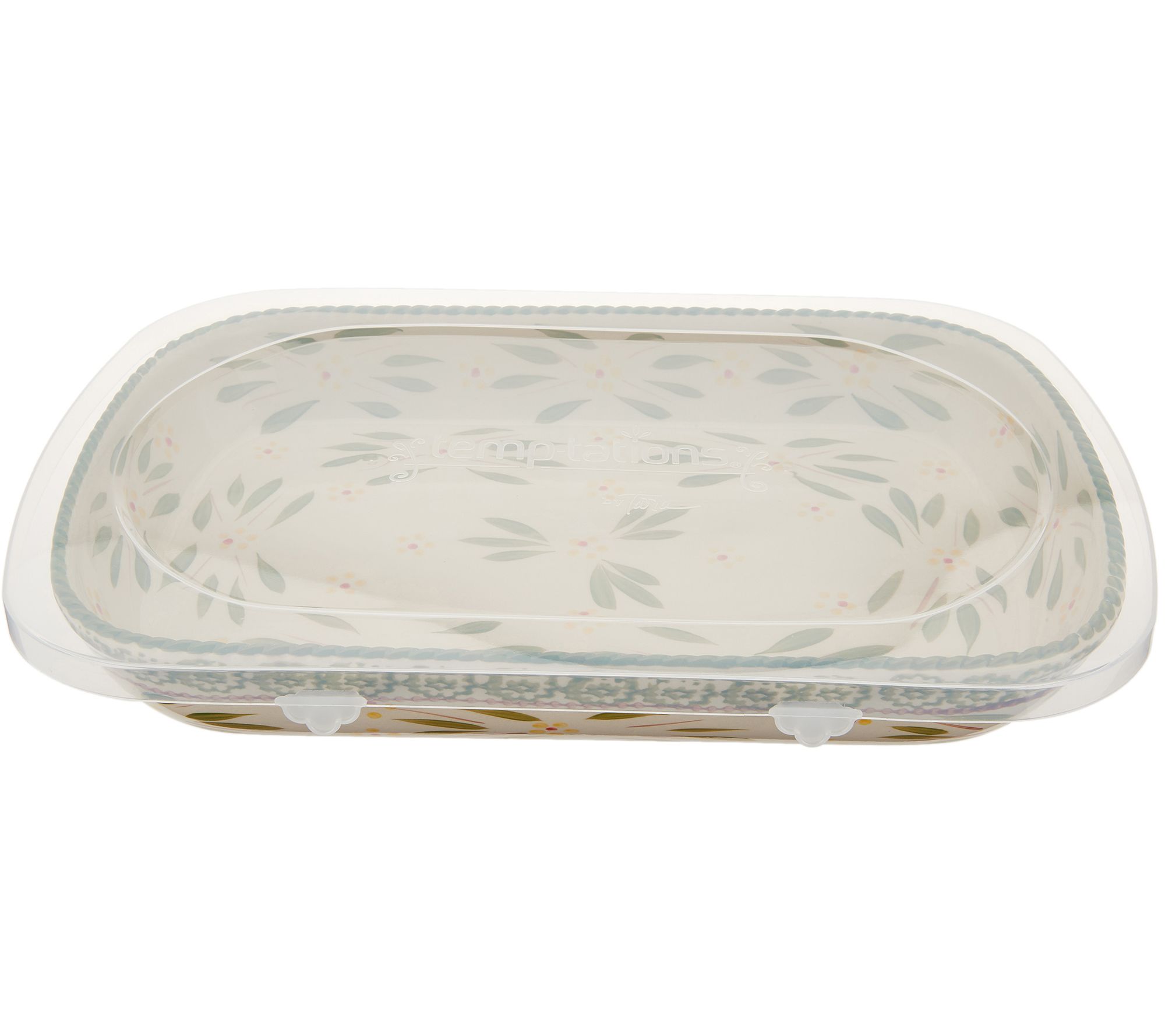 Add temp-tations to your everyday baking experience. Ceramics are hand painted with bold accents and beautiful colors. Set includes: 2 qt deep dish platter with snap-on storage cover. Ceramics are oven safe up to 500 degrees, dishwasher, microwave, refrigerator and freezer safe. 3yr LMW. Imported. Platter 2"H x 9"W x 13-1/2"L ____________________________________________________