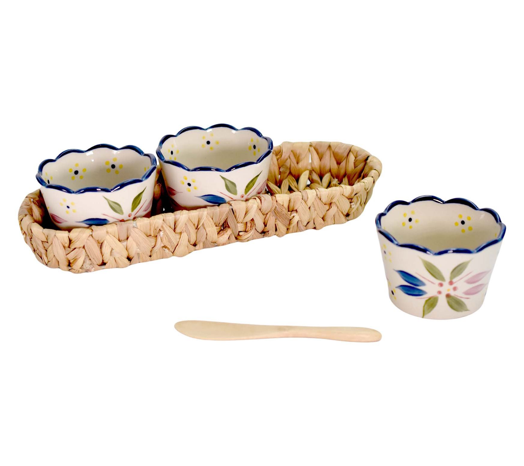 Includes three 6-oz ceramic bowls, hyacinth basket, and spreader