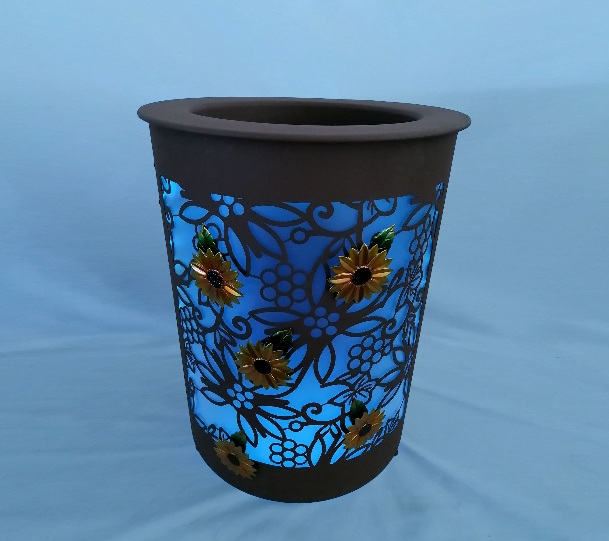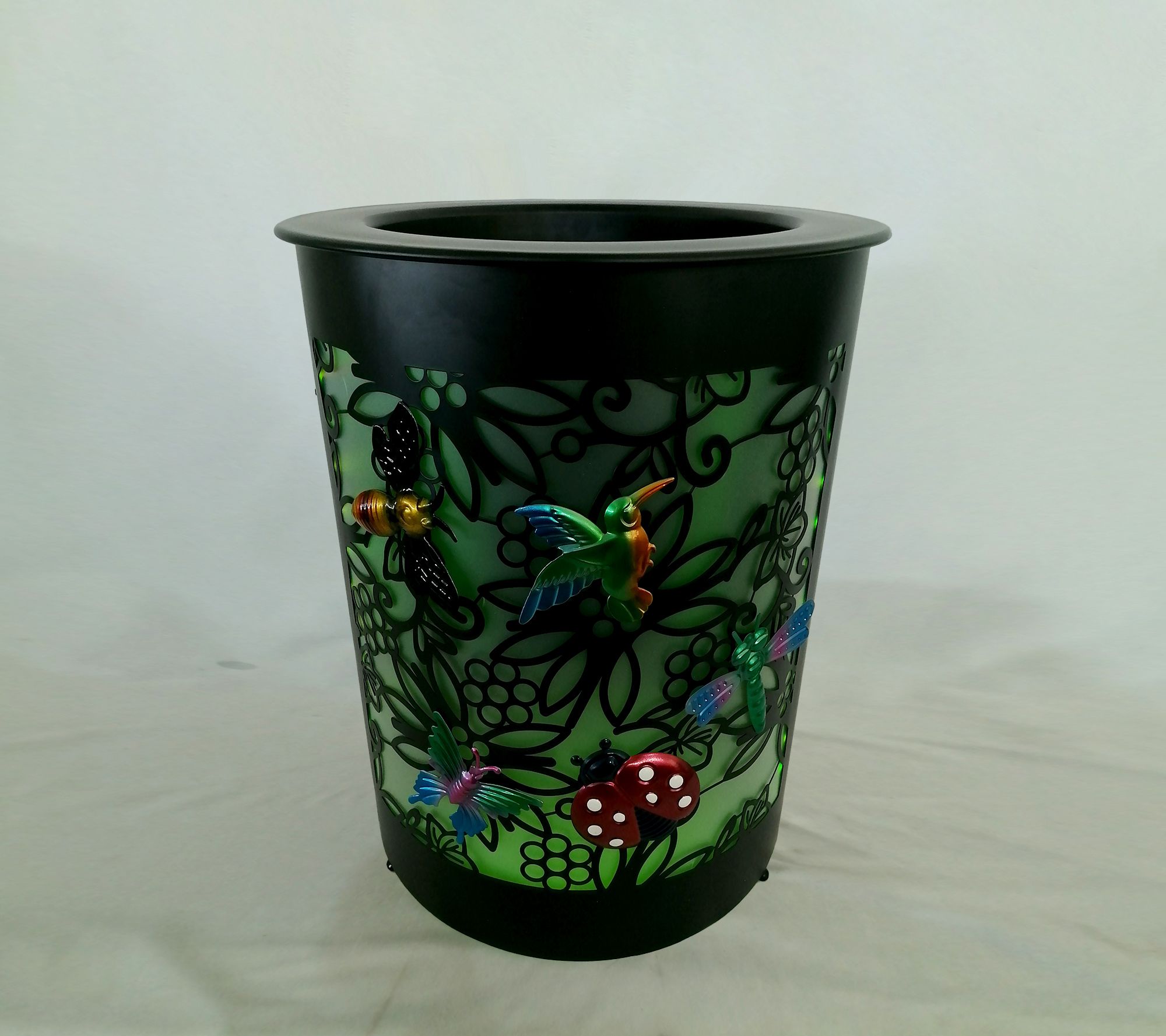 Approximate measurements: Planter 16.5" x 16.5" x 21", Interior planter 16.5" x 16.5" x 12"; Lady bug 3.75" x 4.125" x 0.2"; Bumblebee 5.5" x 3.375" x 0.22"; Butterfly 3.9" x 3.8" x 0.18"; Hummingbird 3.15" x 3.9" x 0.21"; Dragonfly 5.1" x 4.5" x 0.2"; Sunflower 4.125" x 3" x 0.23"