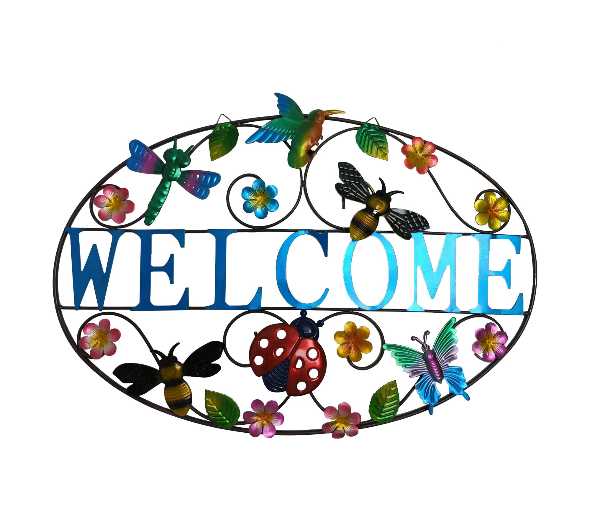 Greet guests with the welcoming whimsy of this decorative sign. Perfect for adding warmth and personality to your home, the metal design not only displays an inviting message, but also features flowers and critters that appear to flitter all around. From Temp-tations®.