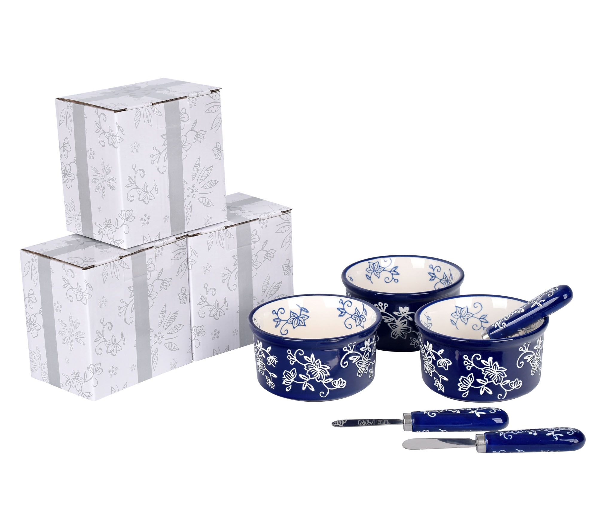 Includes three 8-oz ramekins, three spreaders, and three gift boxes