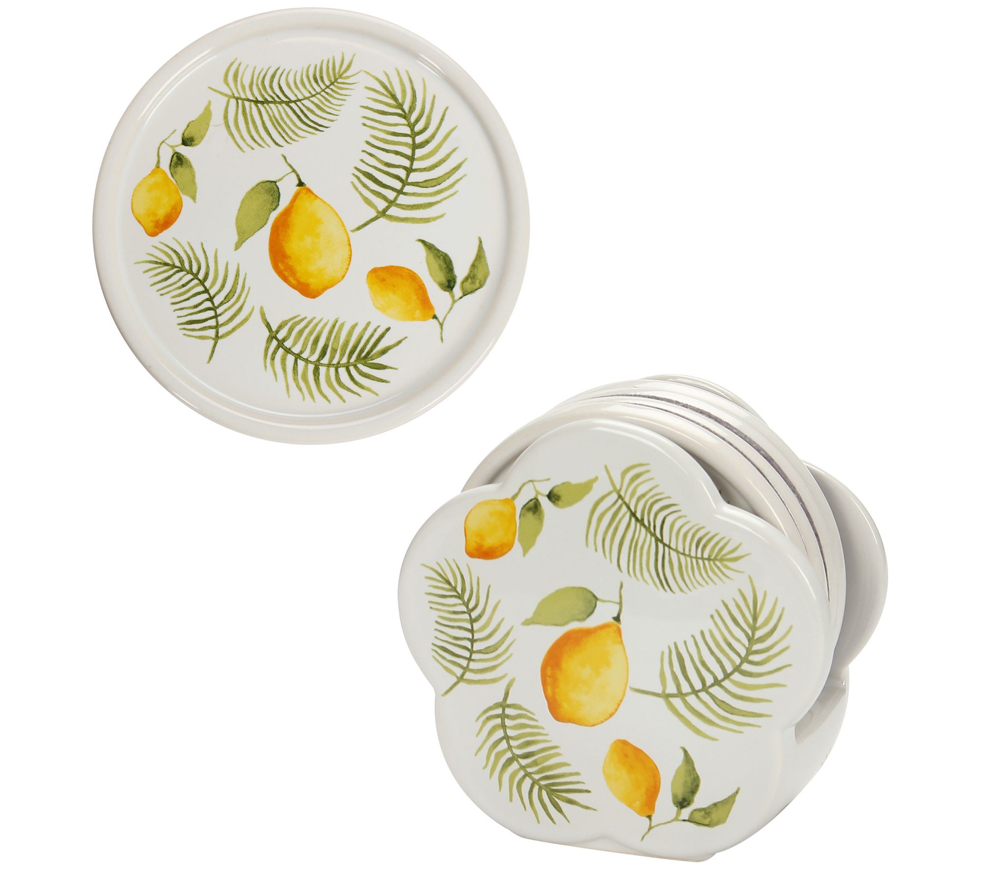 Bring a touch of elegant charm to your home while protecting your table from rings and sweaty glasses with this set of four ceramic stoneware coasters, featuring a beautiful design and a convenient coordinating base for storage. From Temp-tations® Ovenware.