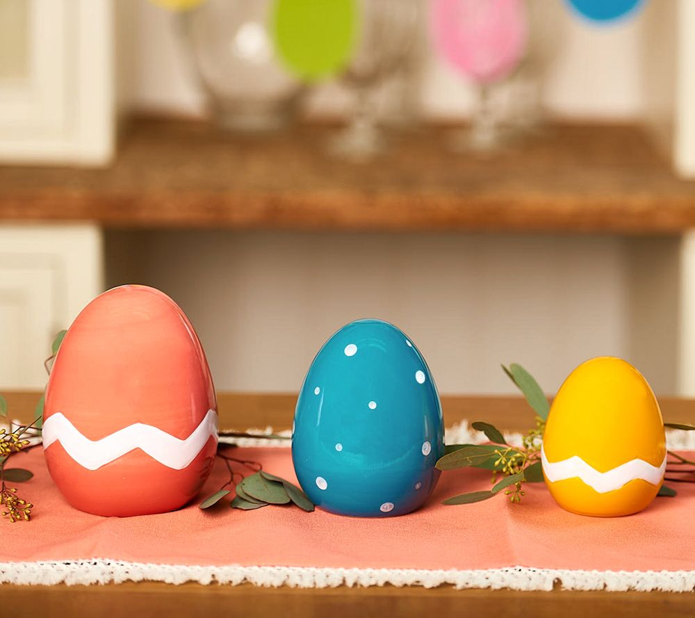 Bring eggs-cellent style and a refreshing breath of spring to a centerpiece, windowsill, or kitchen shelf with this fun set of three colorfully painted eggs. From Temp-tations®.