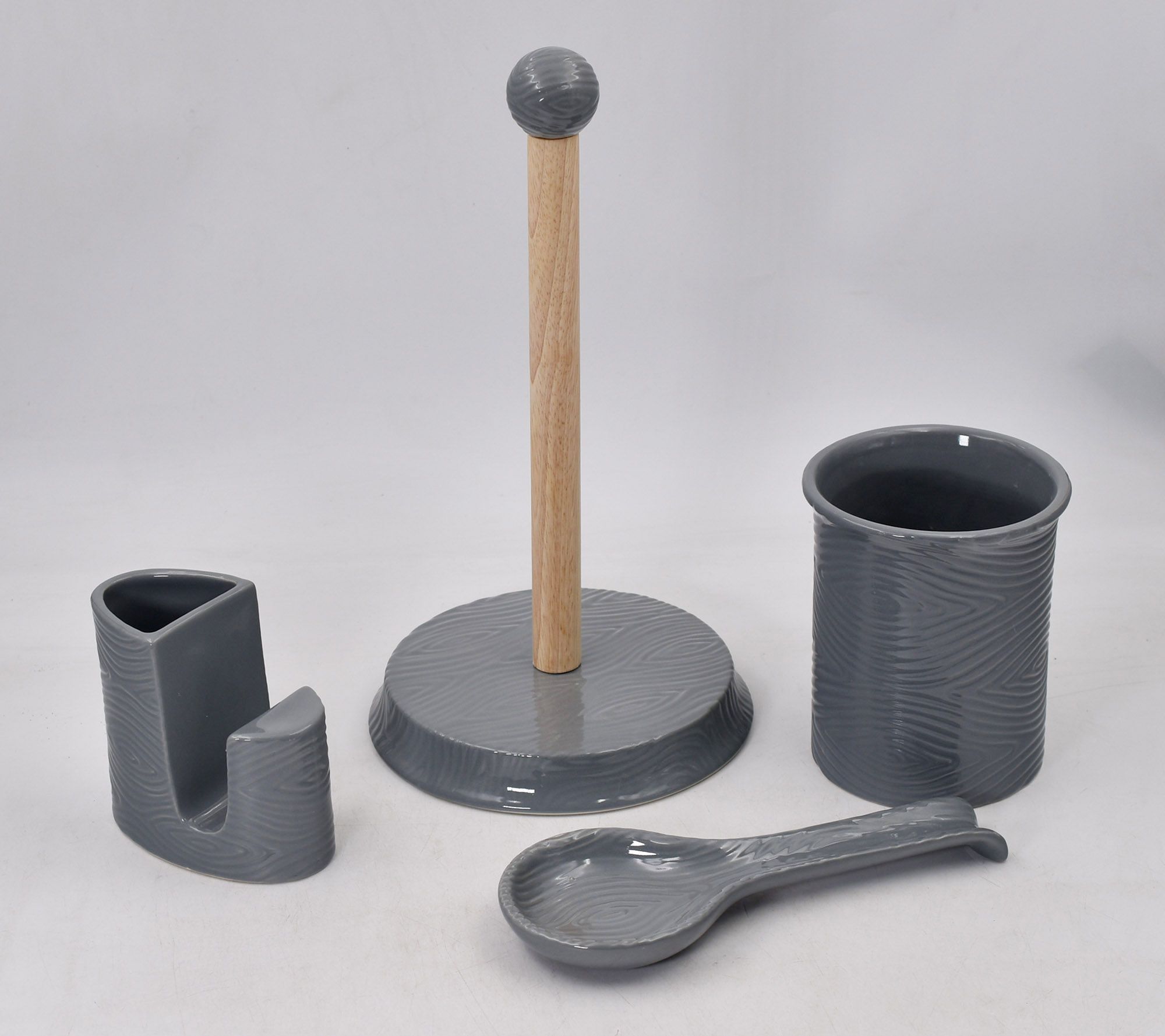 Includes utensil holder, spoon rest, paper towel holder, sponge and utensil holder