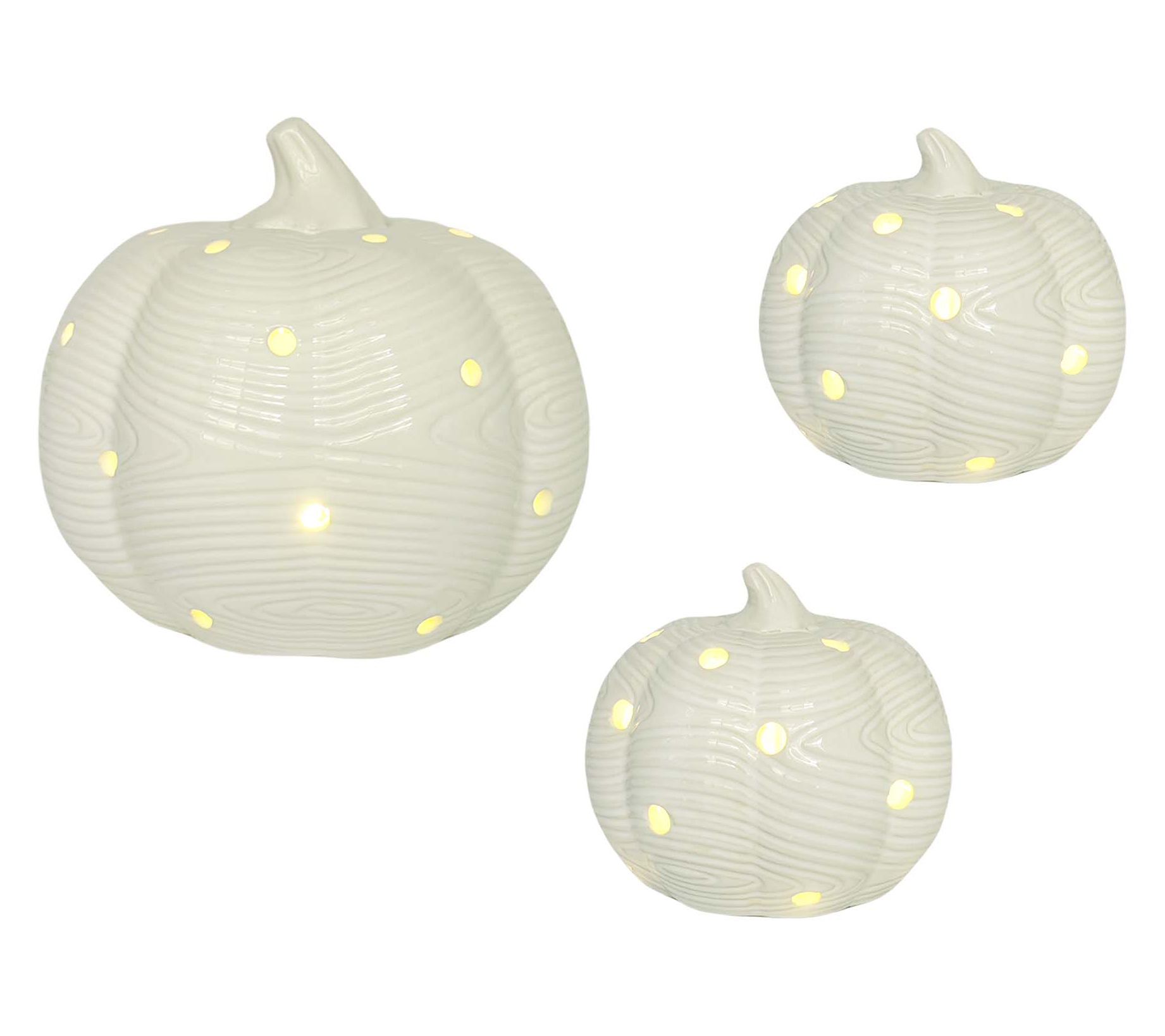 Hello, gourd-geous! A warm autumn glow transforms your living room when you place this set of illuminated ceramic pumpkins on a side table or windowsill. Softly lit from within, the woodland-inspired accents bring cozy vibes and seasonal charm to your home, whether welcoming guests or relaxing by candlelight. From Temp-tations®.