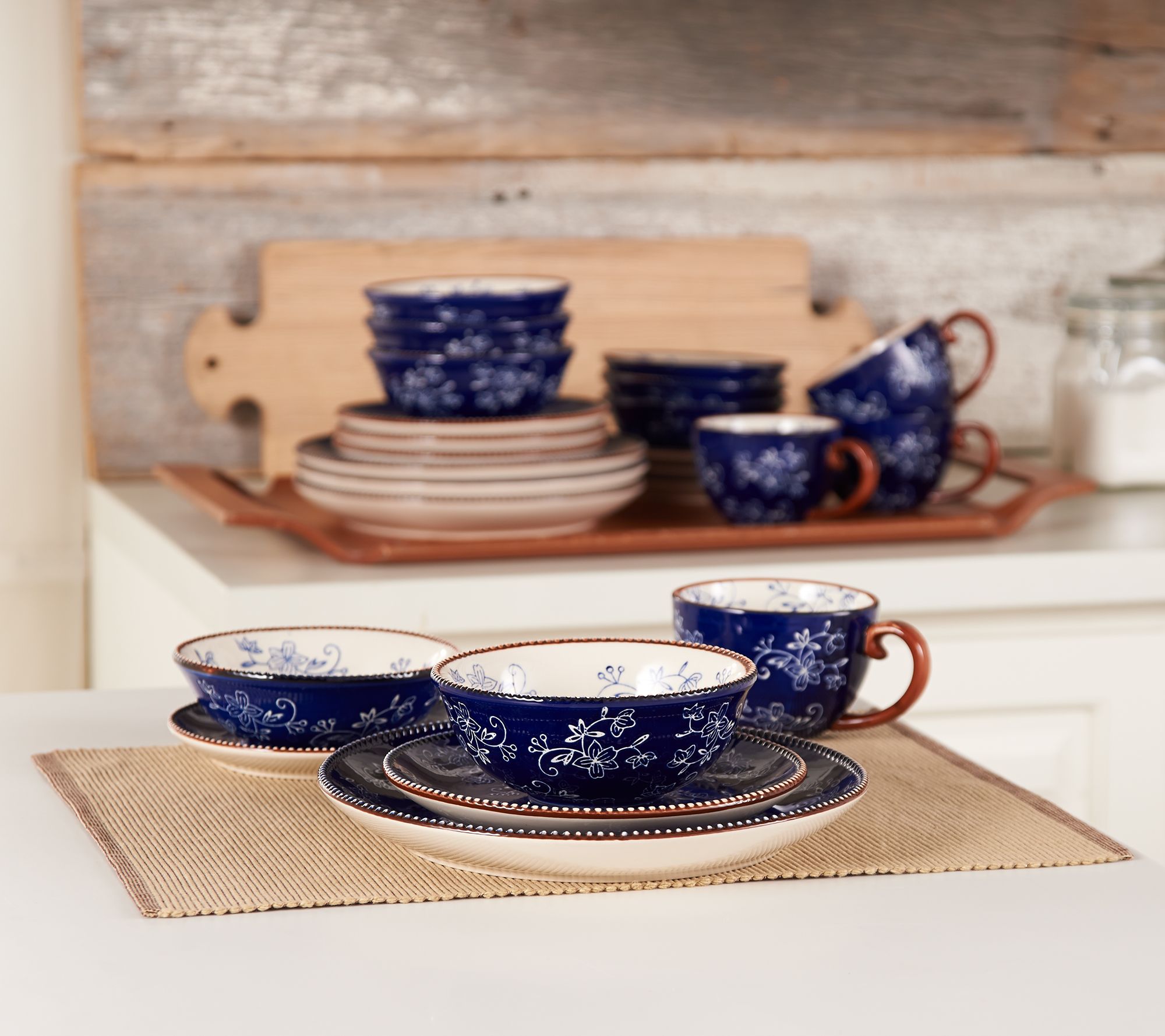 Includes four dinner plates, four salad plates, four appetizer plates, four 16-oz bowls, four 11-oz fruit bowls, and four 12-oz teacups