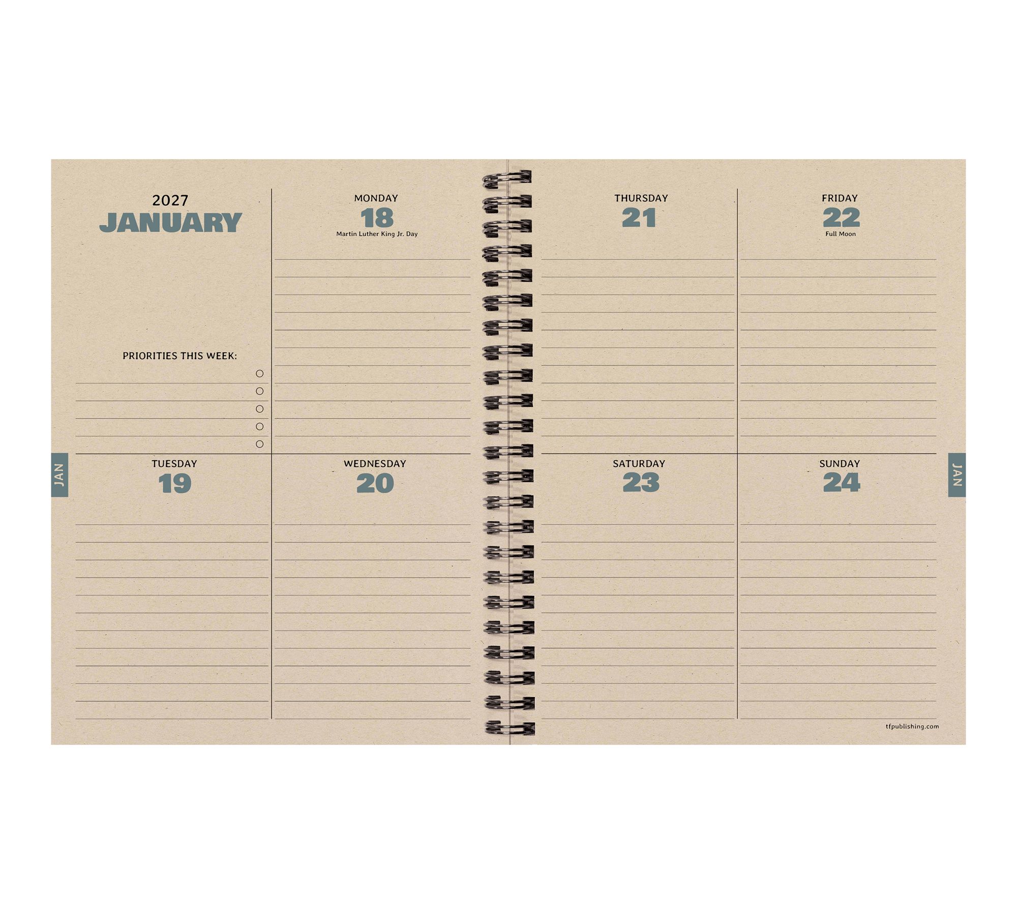 • Interior pages in clean kraft color, accented with faux monthly tabs for easy weekly access