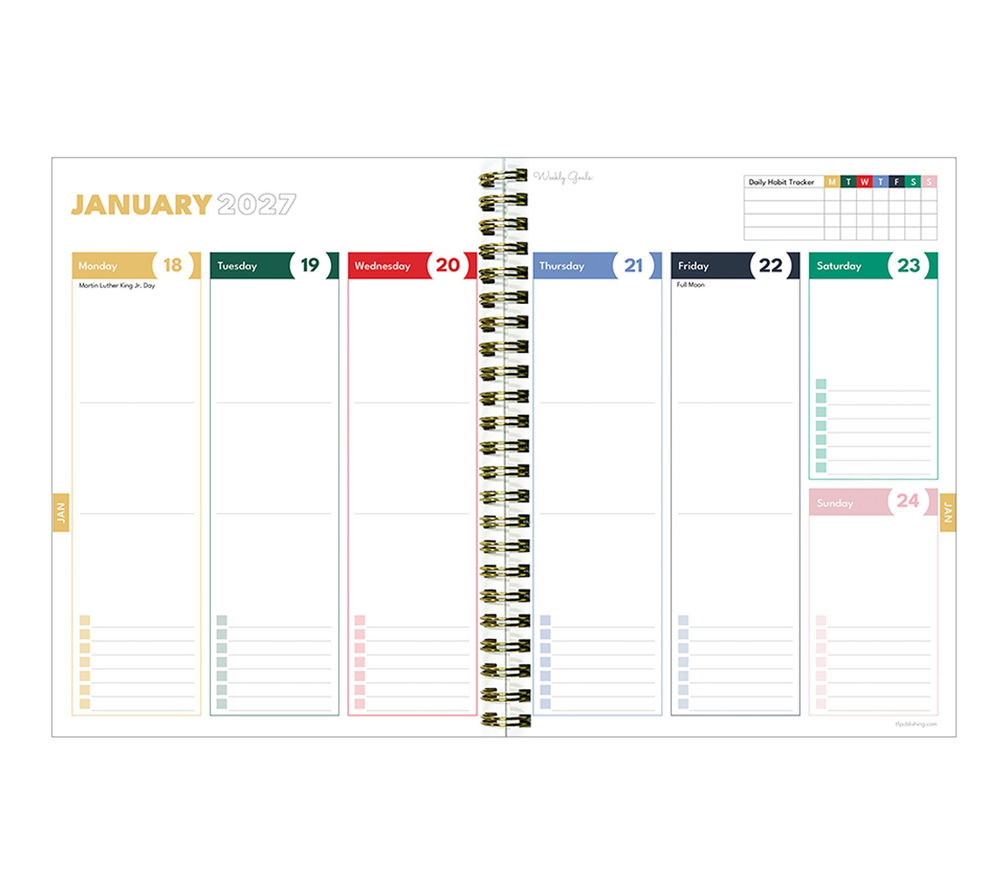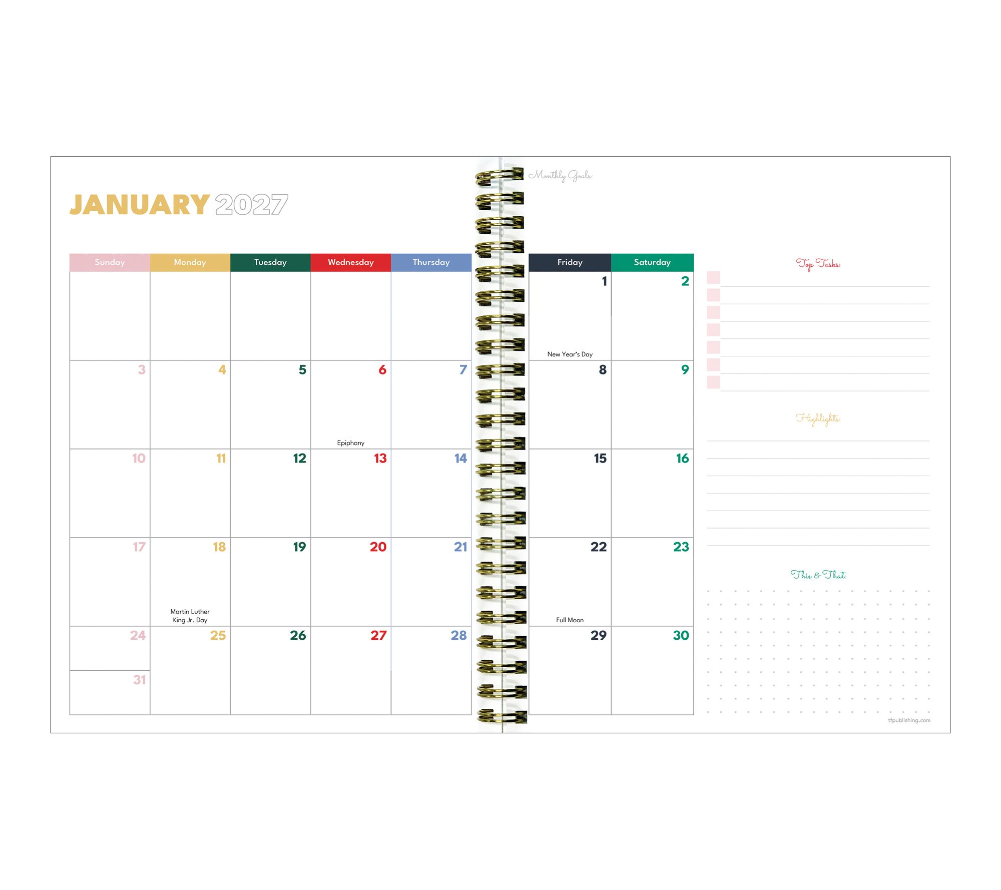 • Two-page monthly spreads with lined sections for notes, tasks, and goals