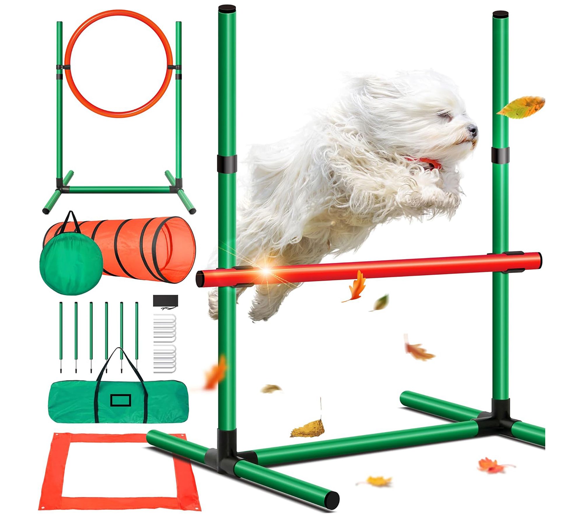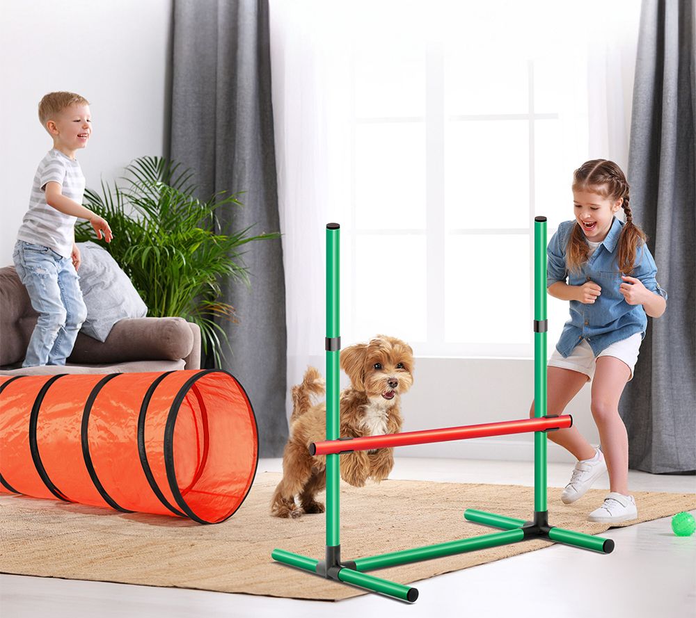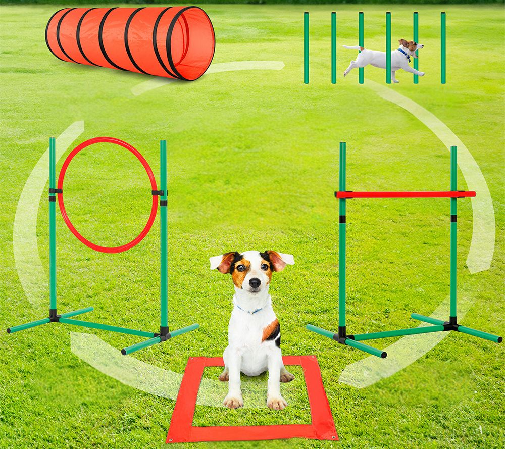 • Measures 70.9" x 23.6" x 23.6" (tunnel); 28.7" (weave poles); 25.8" x 25" x 38.2" (jump ring & high jump); 33.5" x 33.5" (pause box)