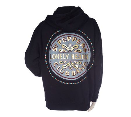 Long live the music. Get cozy with your old Beatles records and this full-zip hooded sweatshirt. Choose grey with a vintage Beatles logo across the chest. Or, choose black with the back displaying a metallic gold foil drum--St. Pepper's, of course.