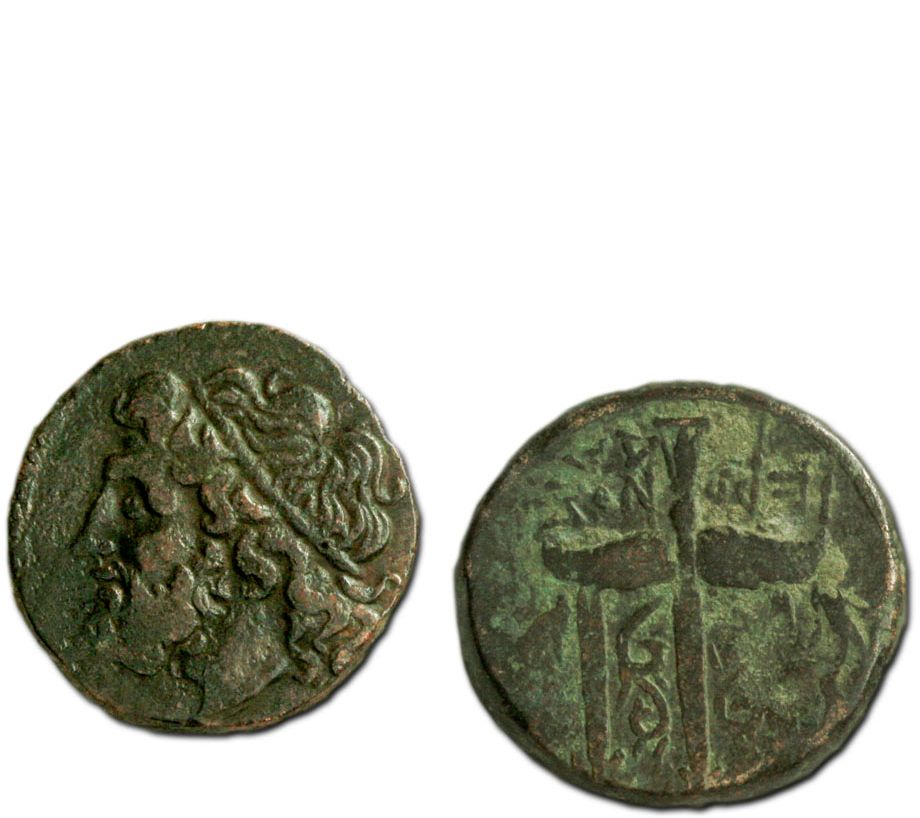 • Syracuse; bronze; 3rd BCE Syracuse; issued 275 to 215 BCE; 5.8 to 7.5g, 17 to 21mm diameter; head of Poseidon, trident and dolphins
