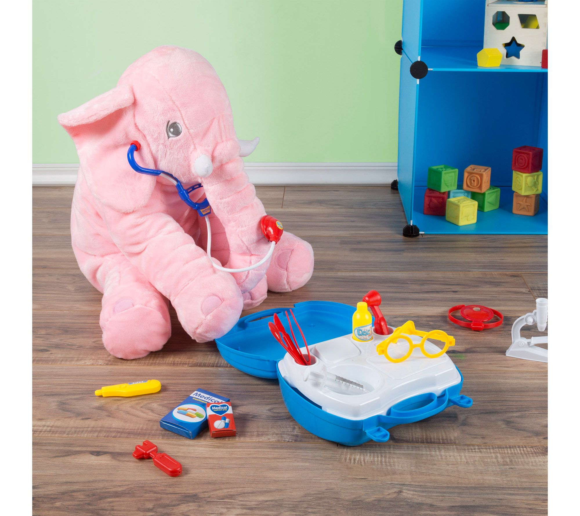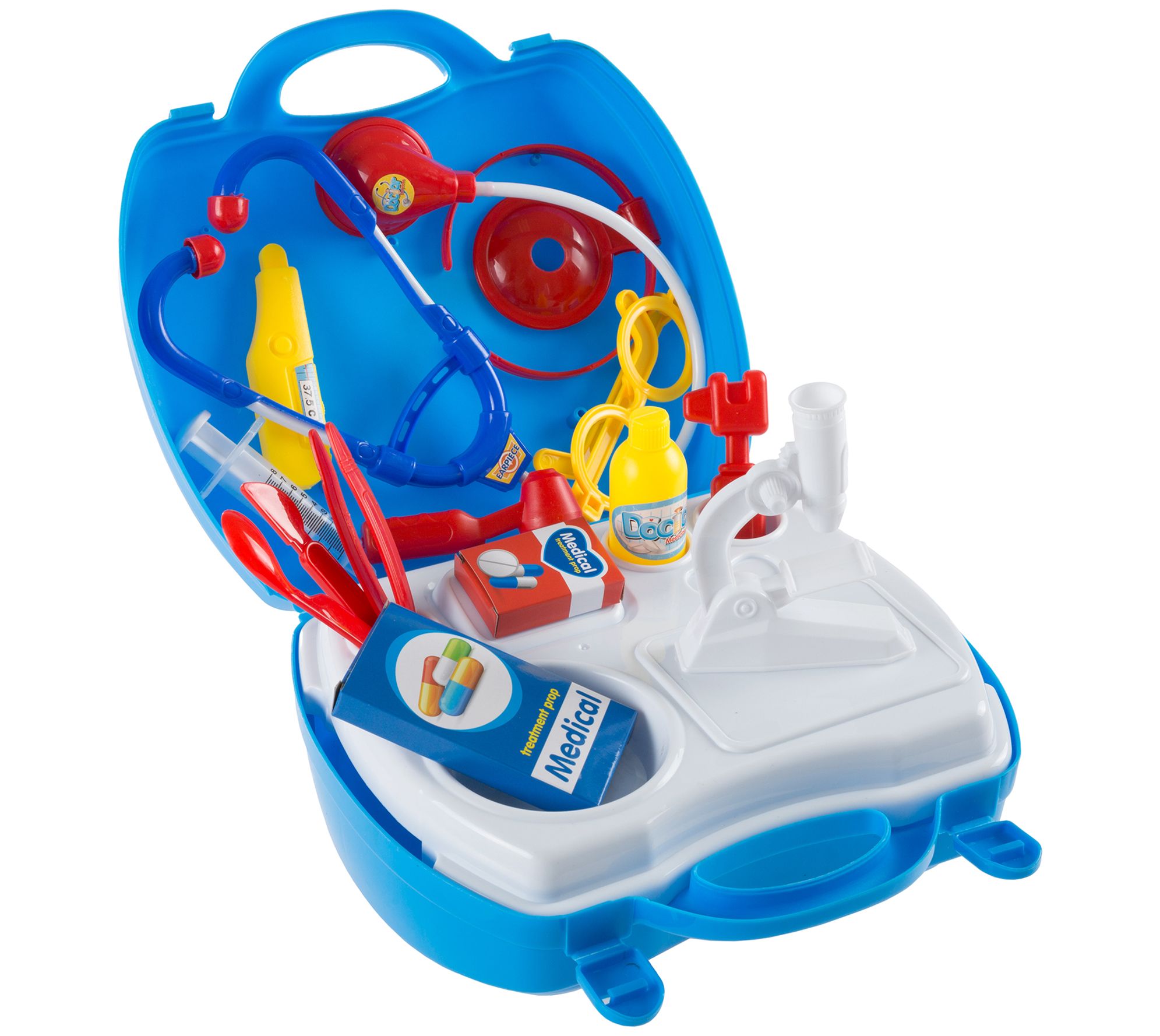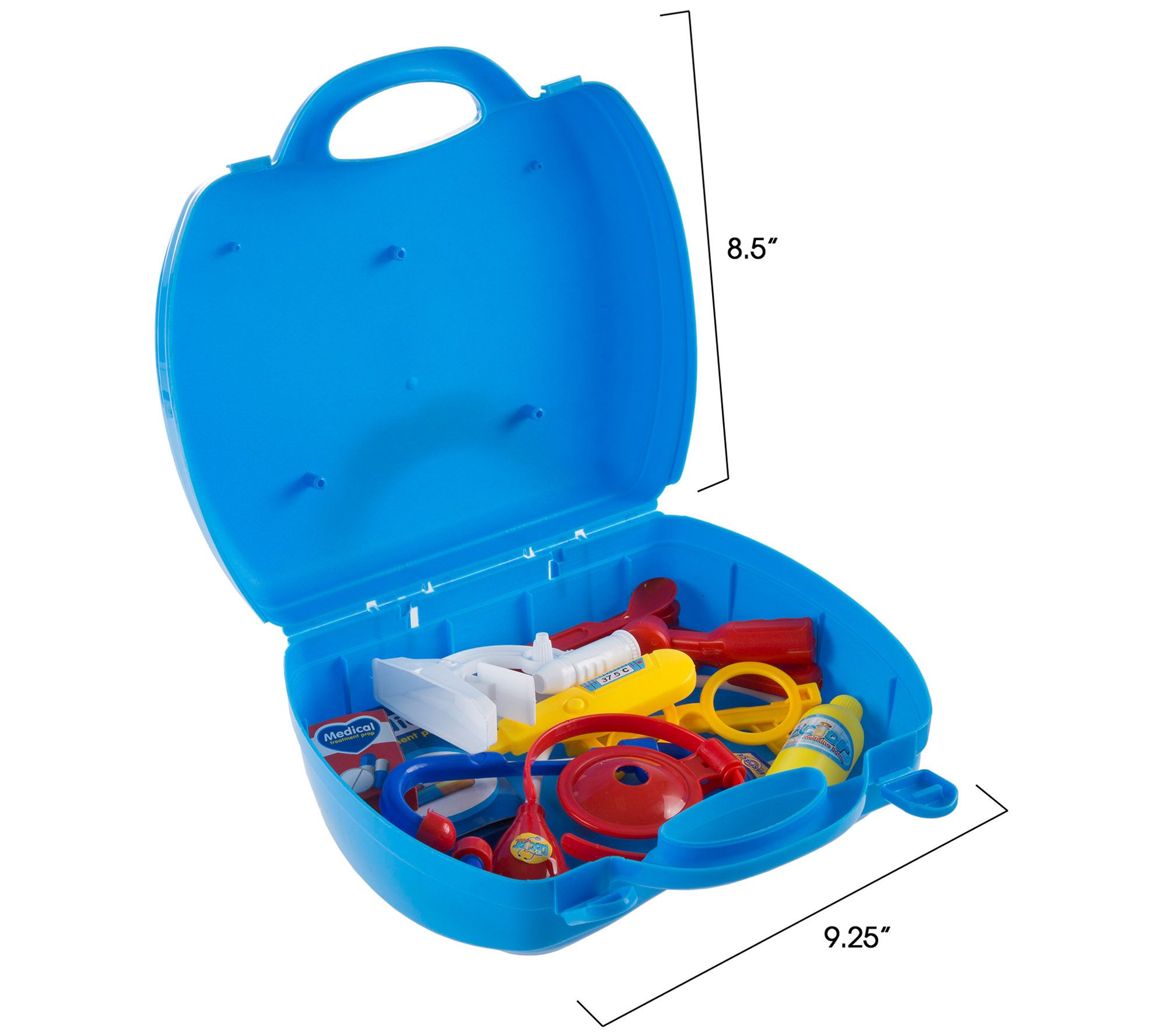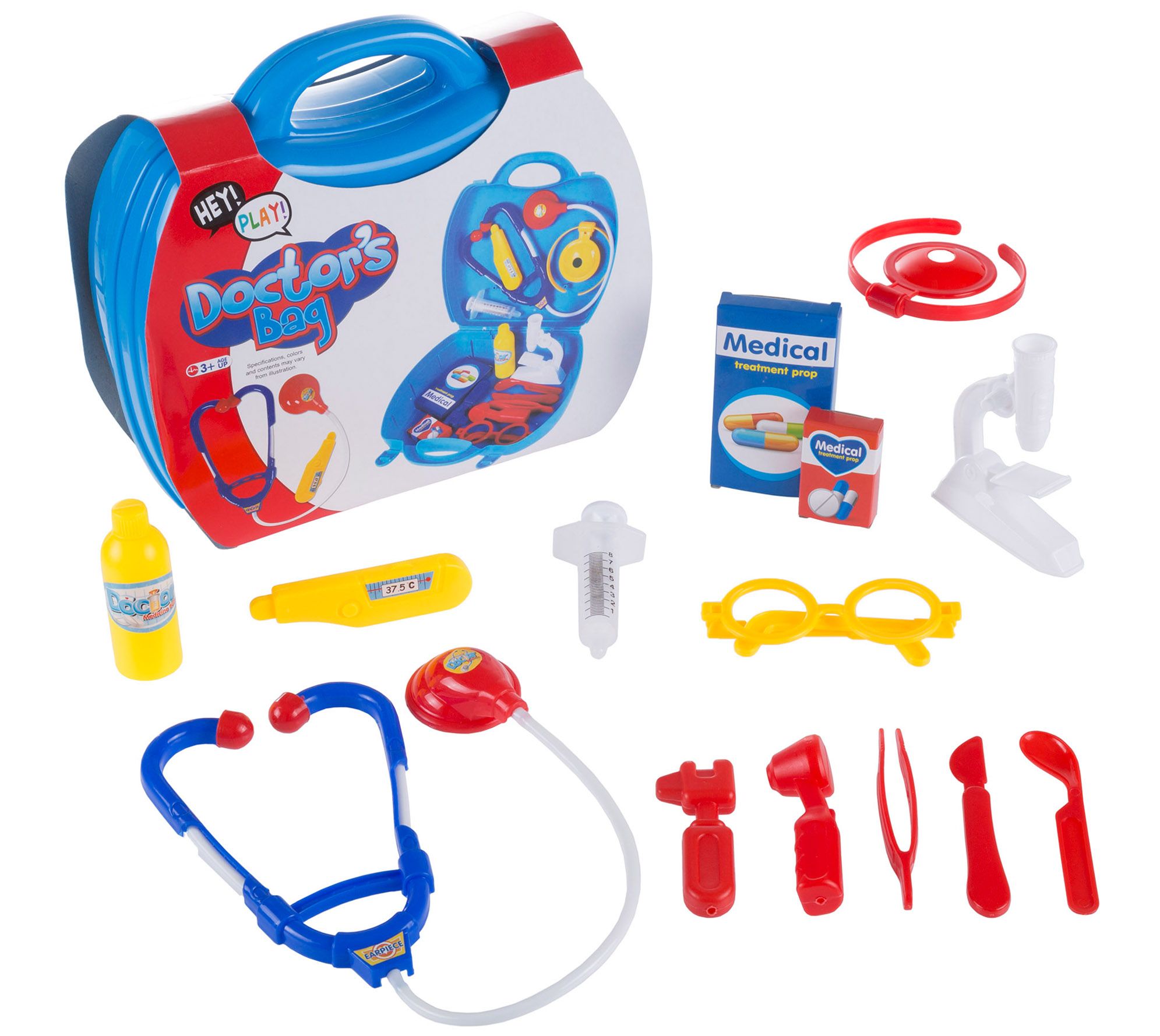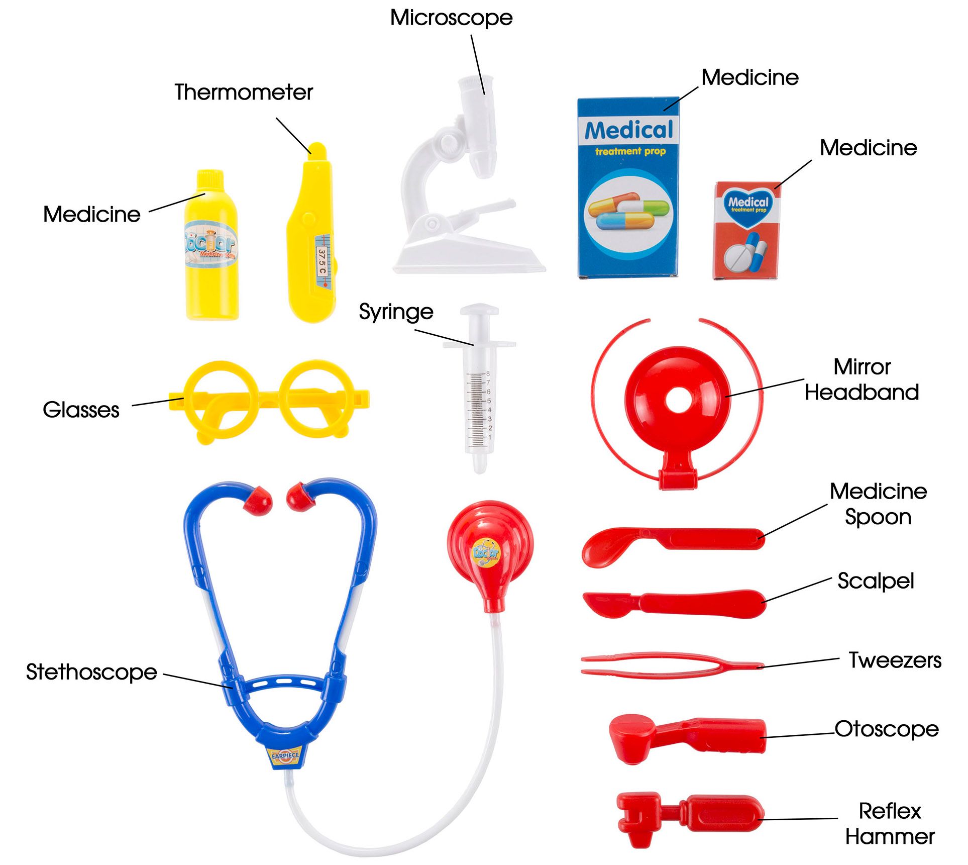 • Includes carry case, stethoscope, glasses, syringe, 3 medicines, thermometer, microscope, mirror headband, medicine spoon, scalpel, tweezers, otoscope, and reflex hammer