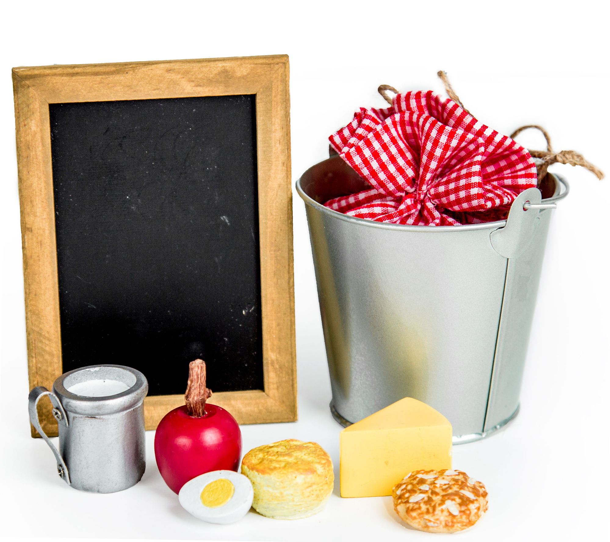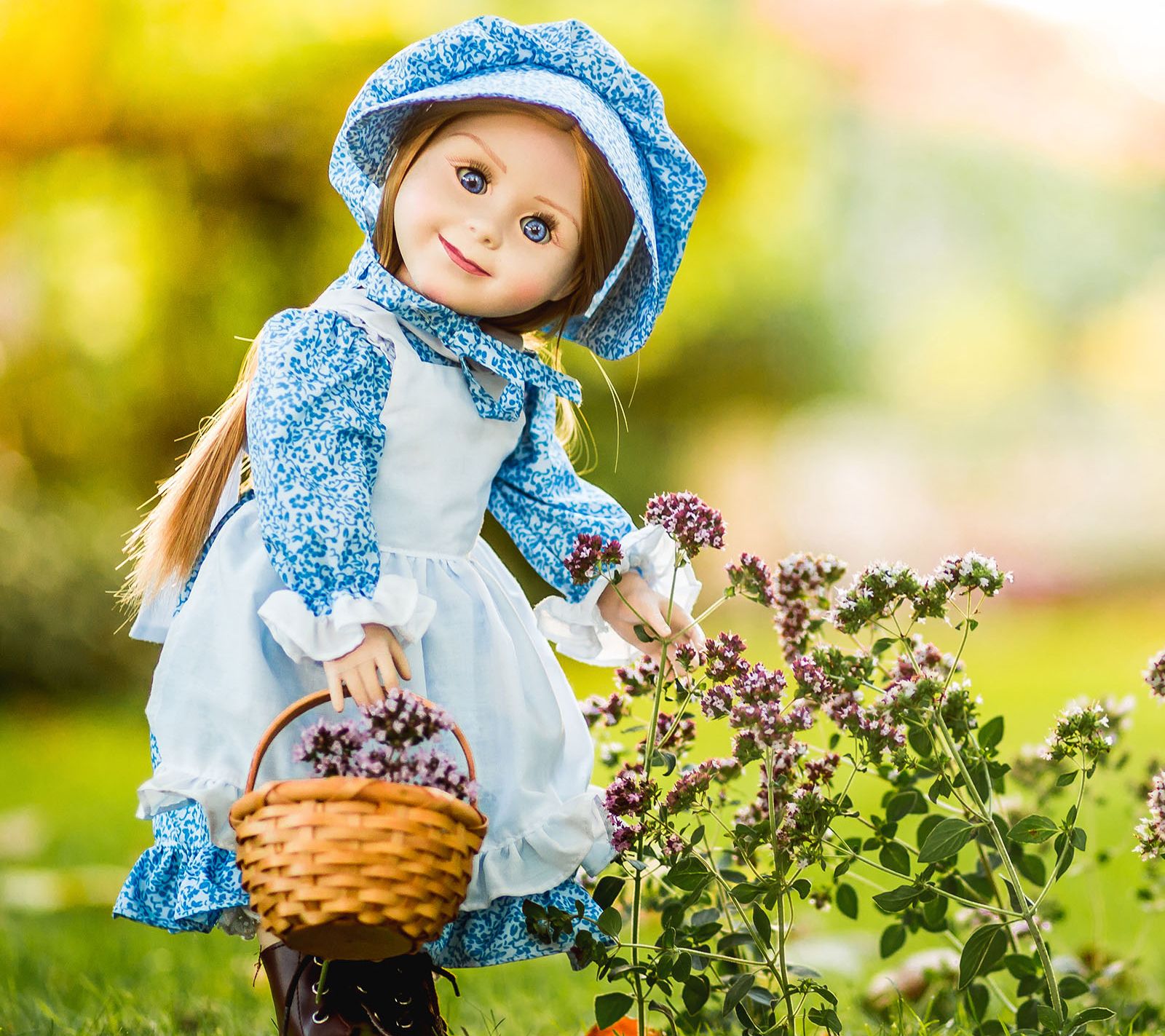• Includes doll, blue calico dress, bonnet, apron, pantaloons, gingham-lined lunch pail with drawstring closure, cup, hardboiled egg, cheese wedge, biscuit, apple, cookie, personal chalkboard, and doll box
