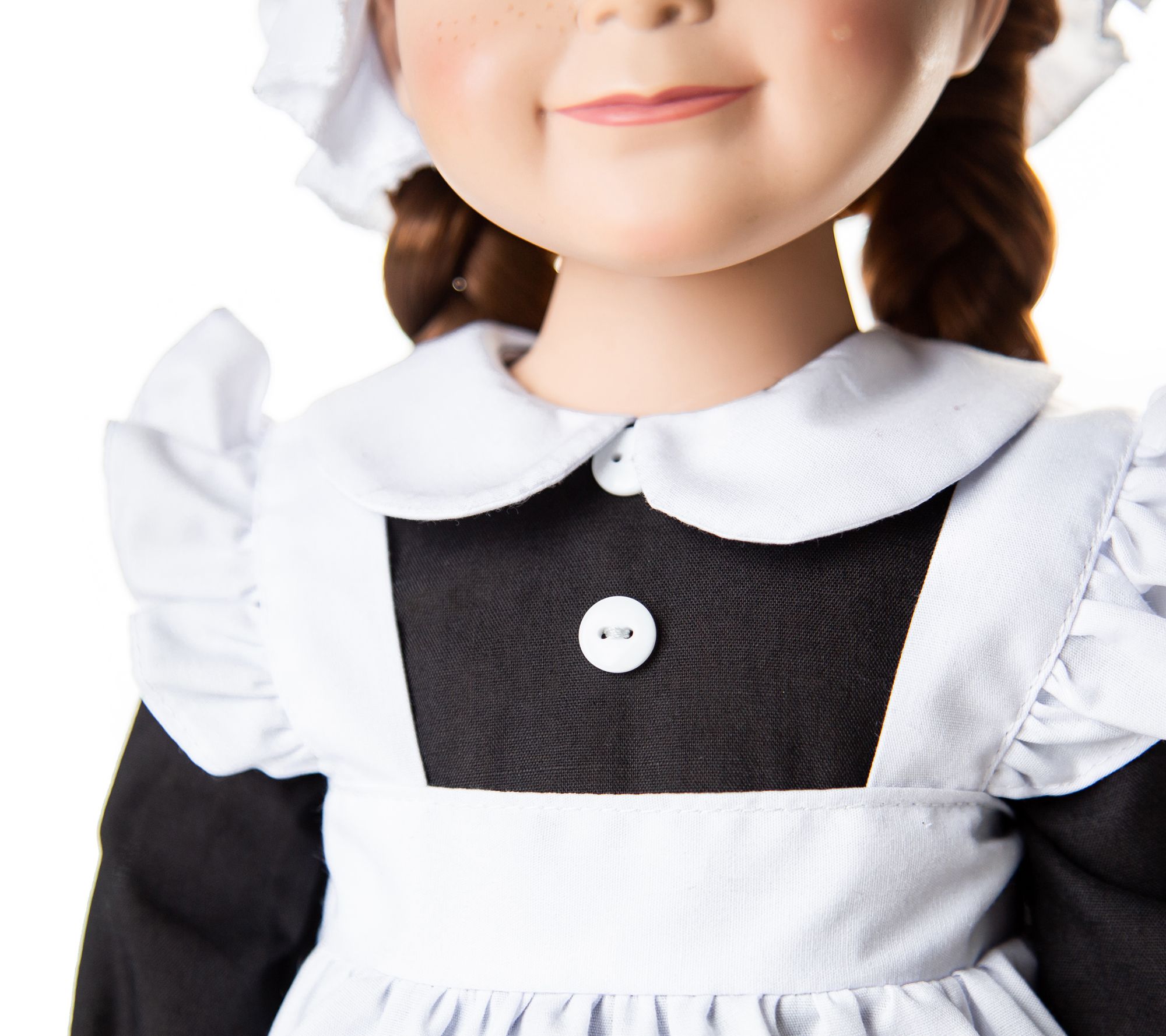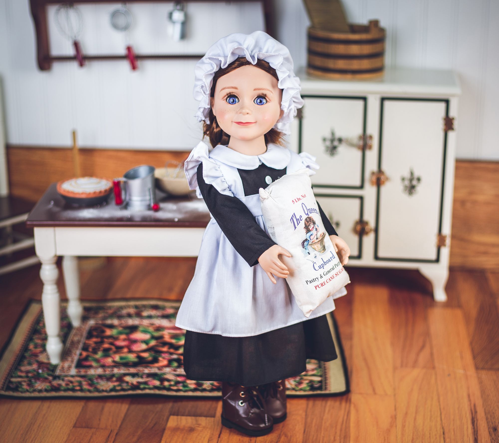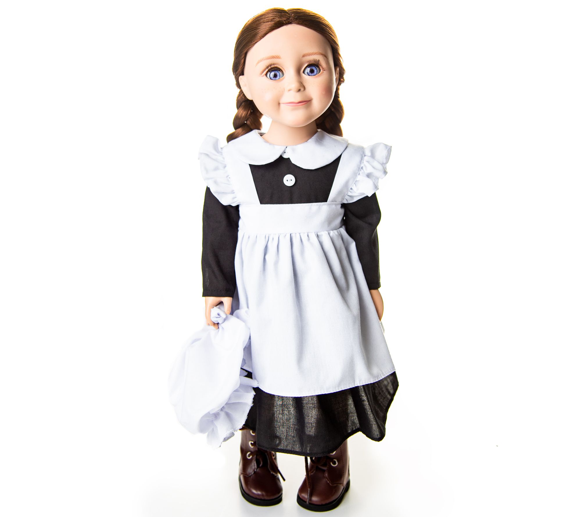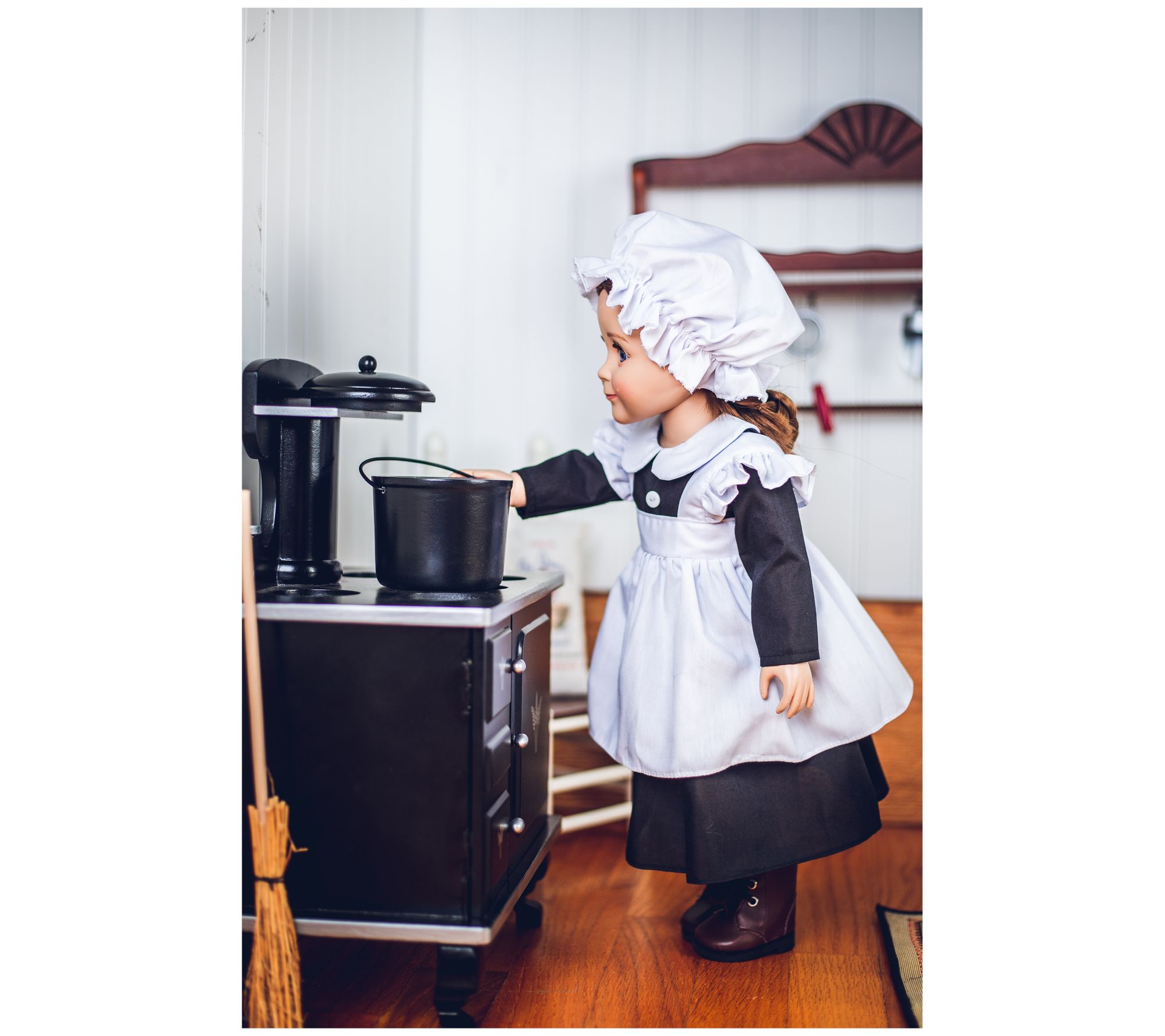 An authentic period dress for an important member of the household, this three-piece scullery kitchen maid outfit for 18" dolls features an empire-waist dress, white underpants, a ruffle apron and a matching elasticized bonnet, a perfect fit for hours of imaginative play. The easy-fit design features a Puritan collar for the dress and the set is safety-tested. From The Queen's Treasures.