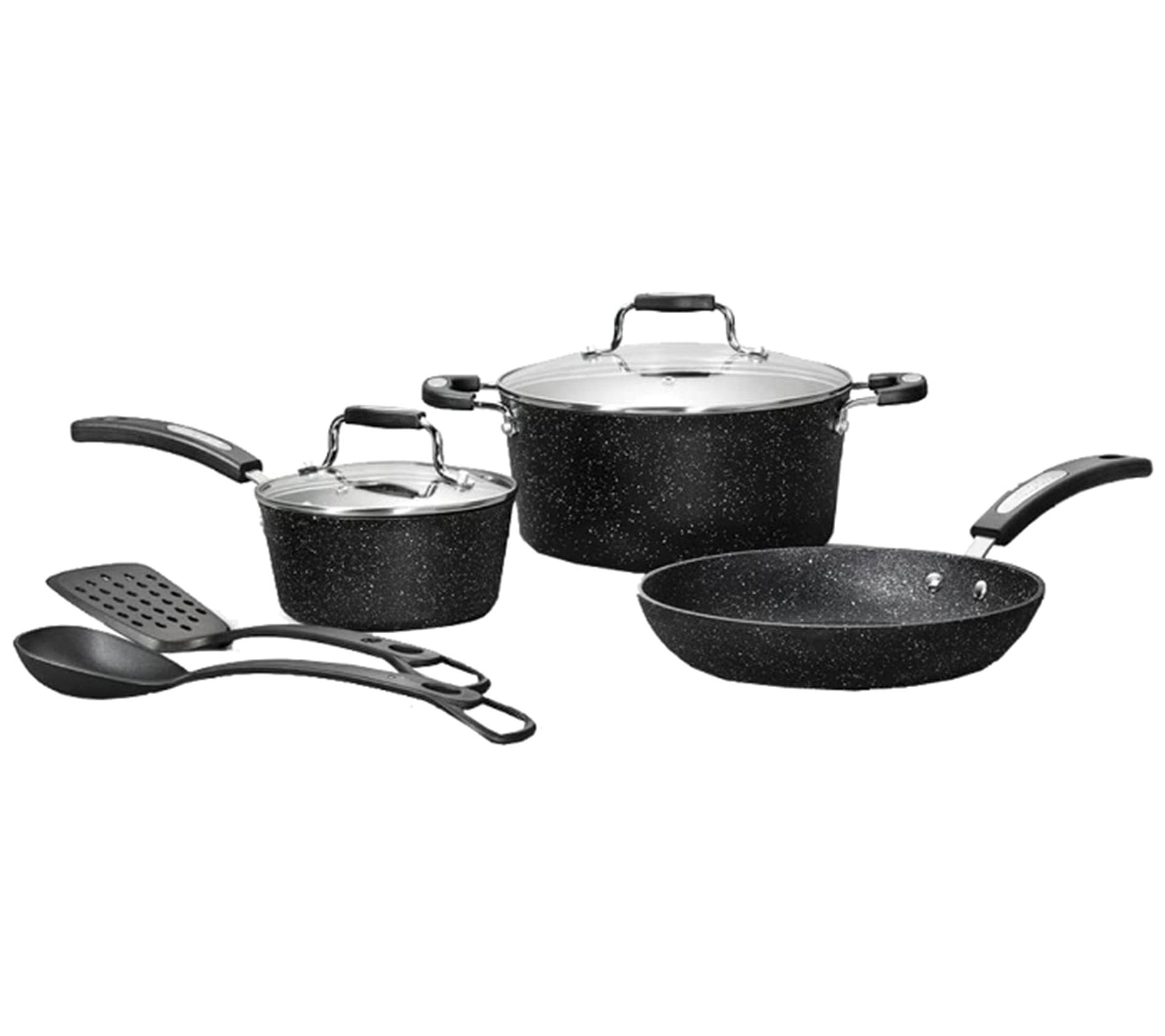• Includes 1.5-qt saucepan with lid, 5-qt stockpot with lid, 9.5" fry pan, nylon spoon, and nylon turner