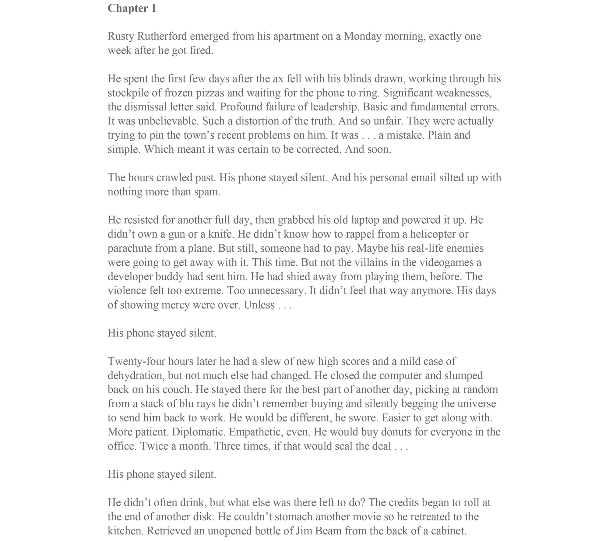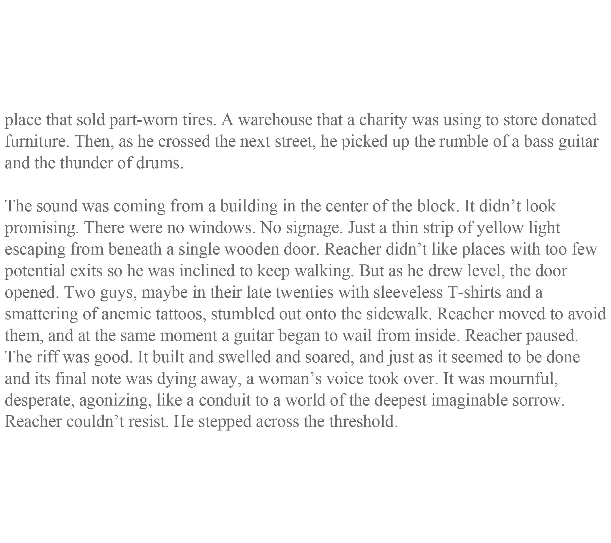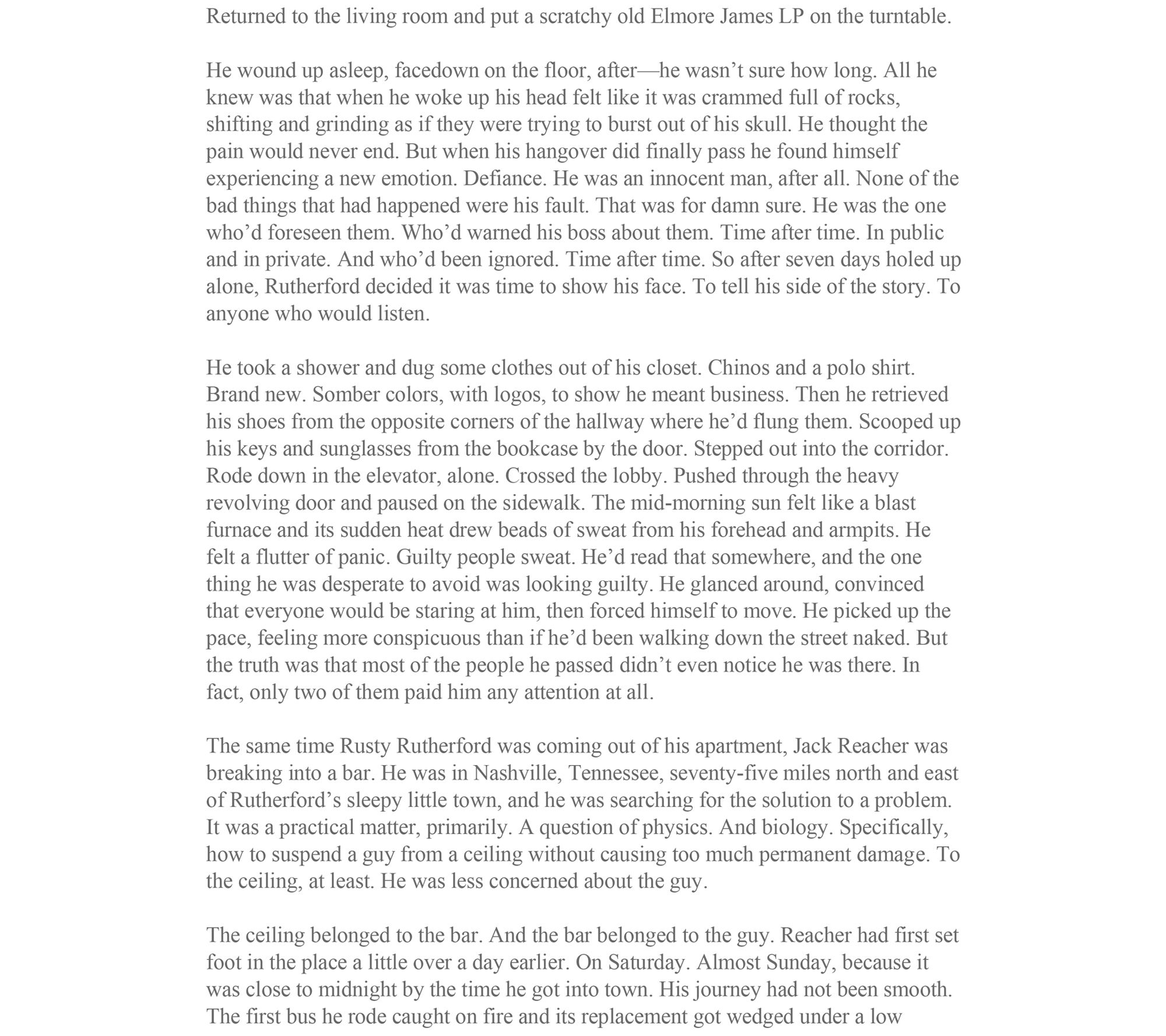 Jack Reacher's landed in a town near Pleasantville, Tennessee, but there's nothing pleasant about it. In broad daylight Reacher spots a hapless soul walking into an ambush. So, Reacher intervenes with his own trademark brand of conflict resolution.The man he saves is Rusty Rutherford, an IT manager recently fired after a cyberattack locked up the town's data...and its secrets. Things are about to get serious and deadly. Rule one -- if you don't know the trouble you're in, keep Reacher by your side.
