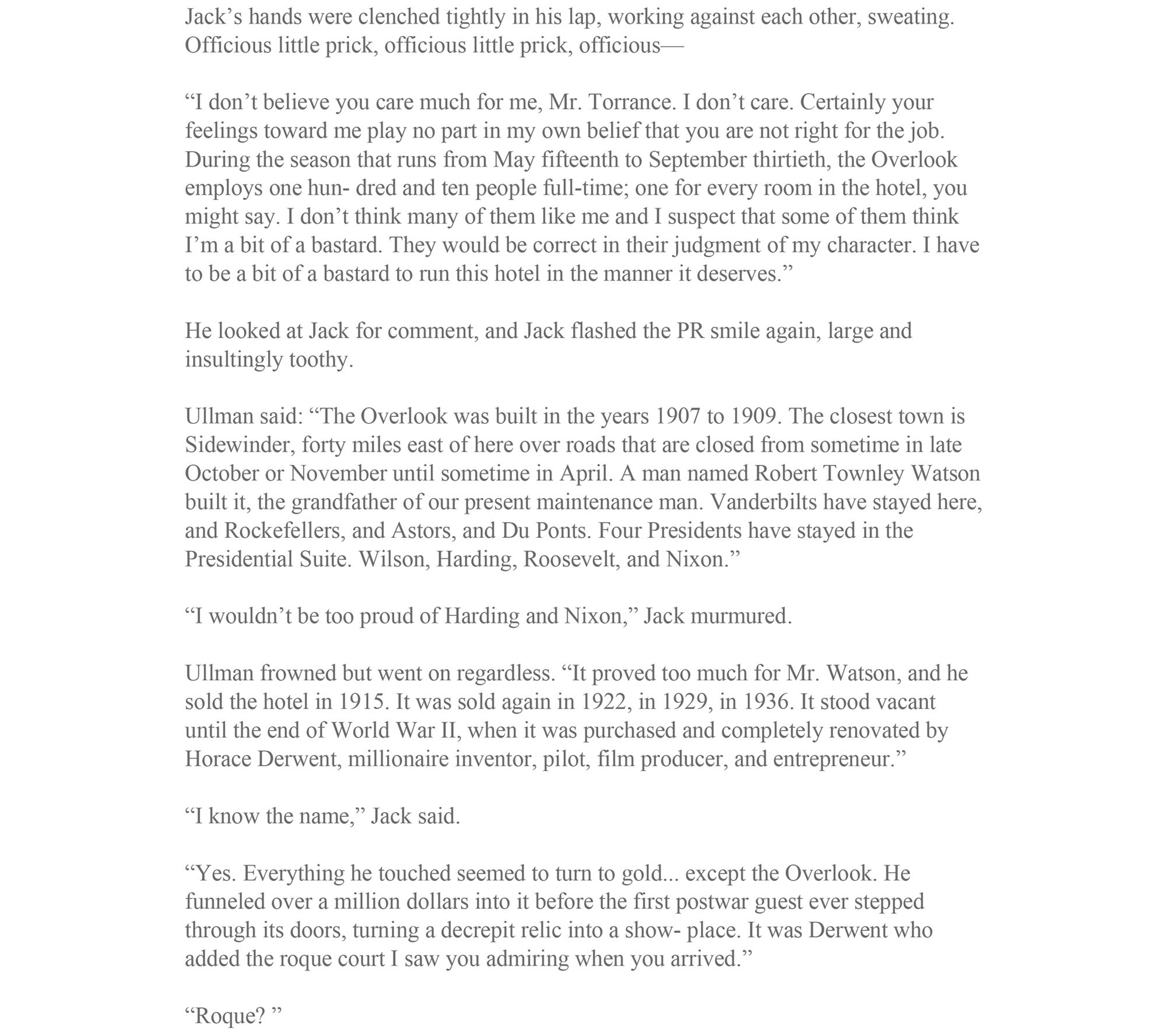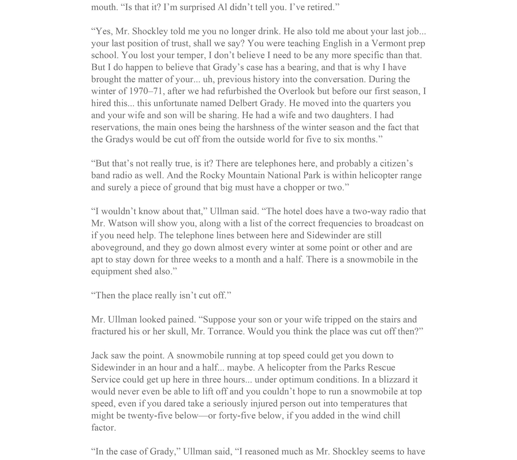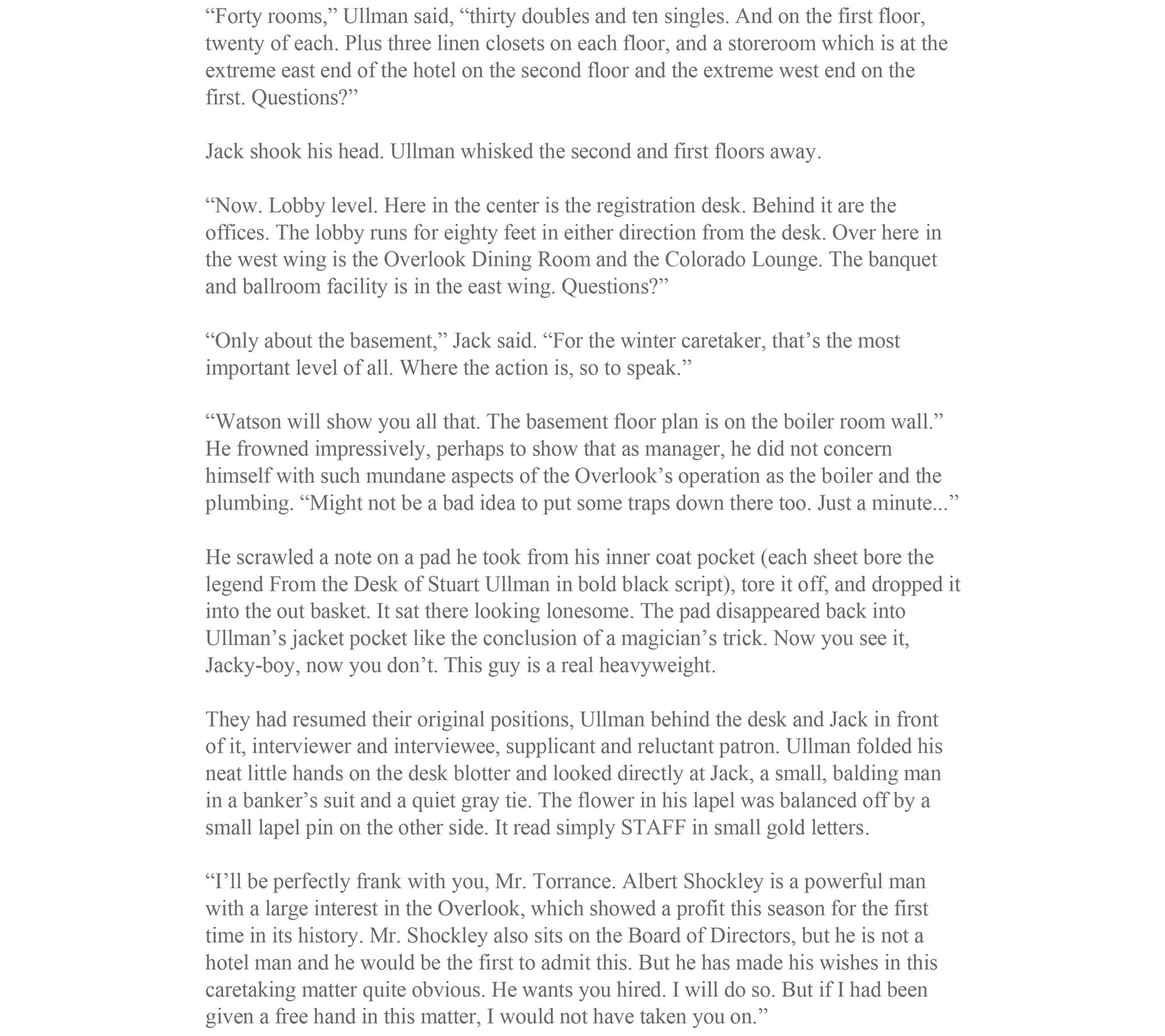 Jack Torrance's new job at the Overlook Hotel is the perfect chance for a fresh start. As the off-season caretaker at the atmospheric old hotel, he'll have plenty of time to spend with his family and on his writing. Then, as harsh winter weather sets in, the idyllic location begins to feel much more remote and sinister. Trapped in the snowy mountain retreat, the only one to notice the strange and terrible forces gathering around the Overlook is Danny Torrance, a uniquely gifted young boy.