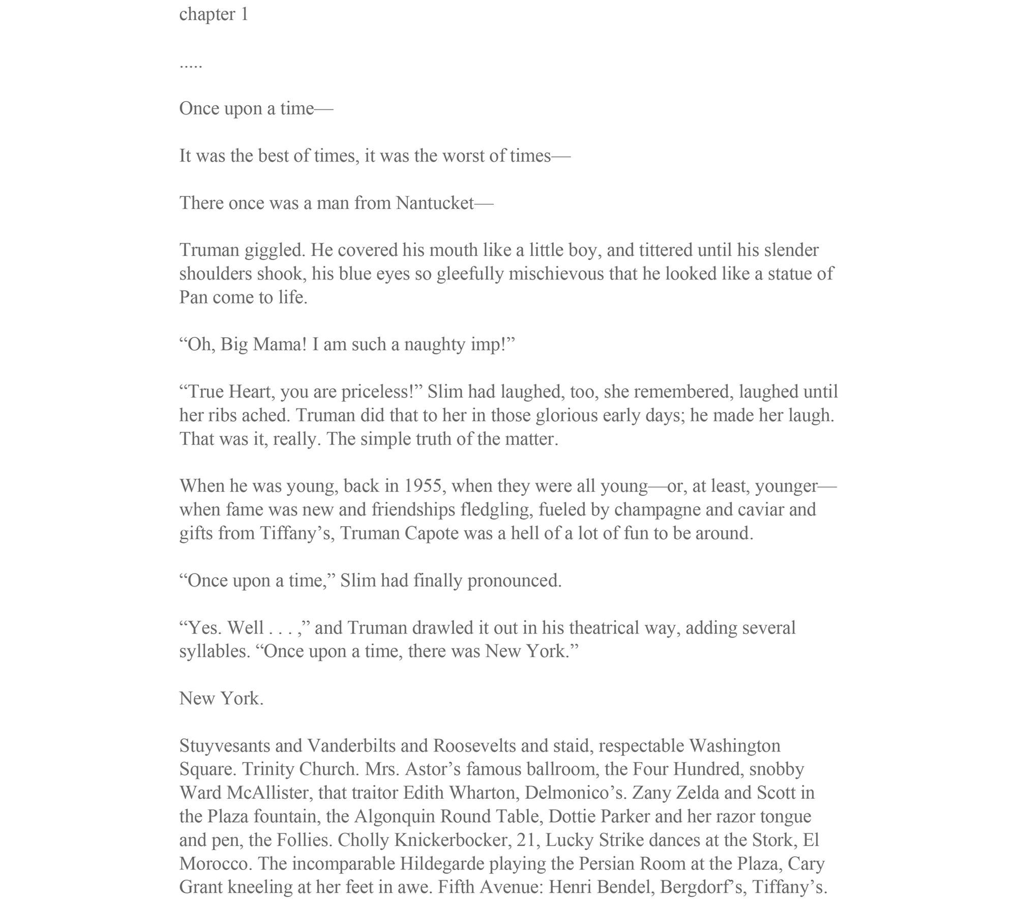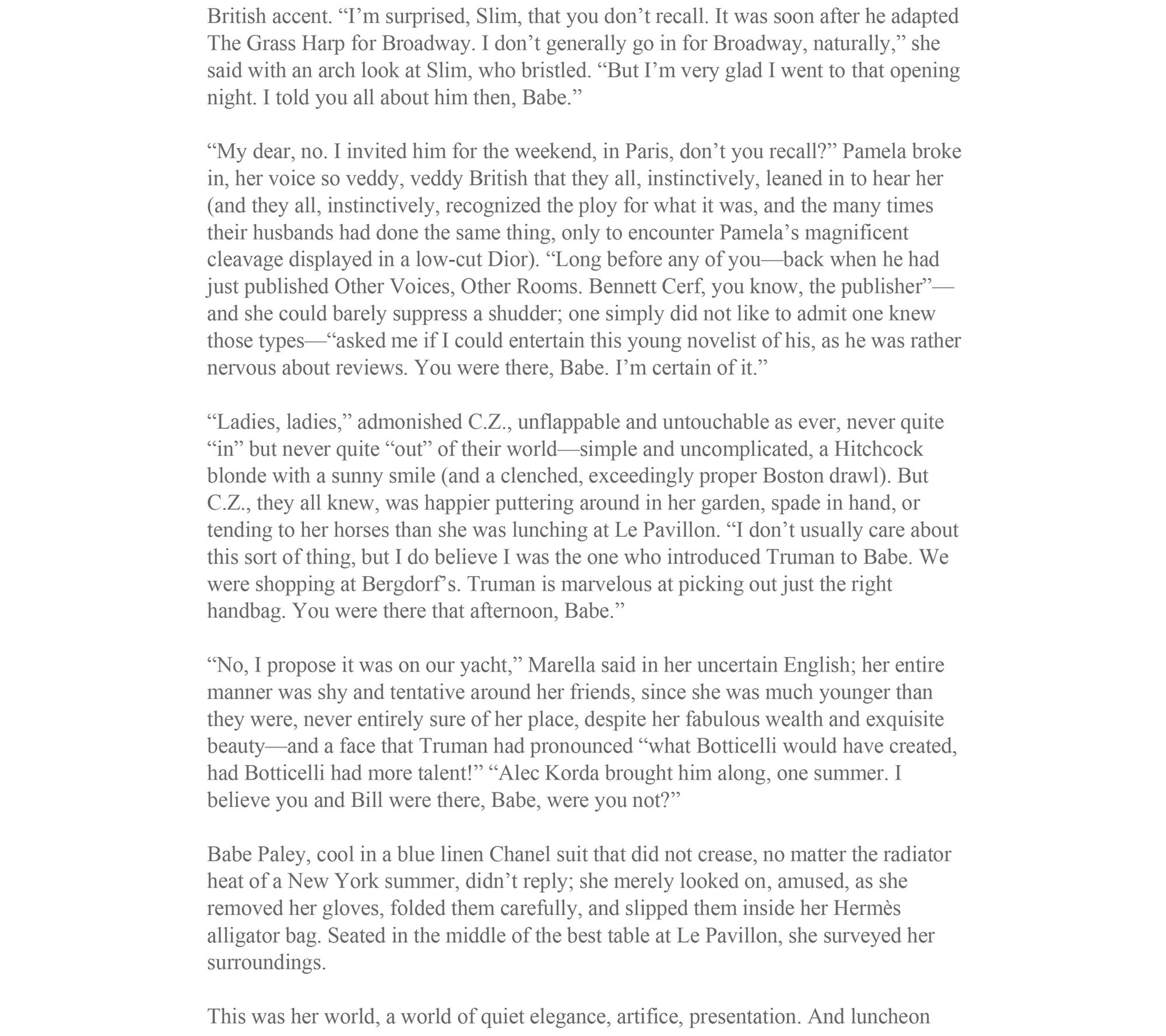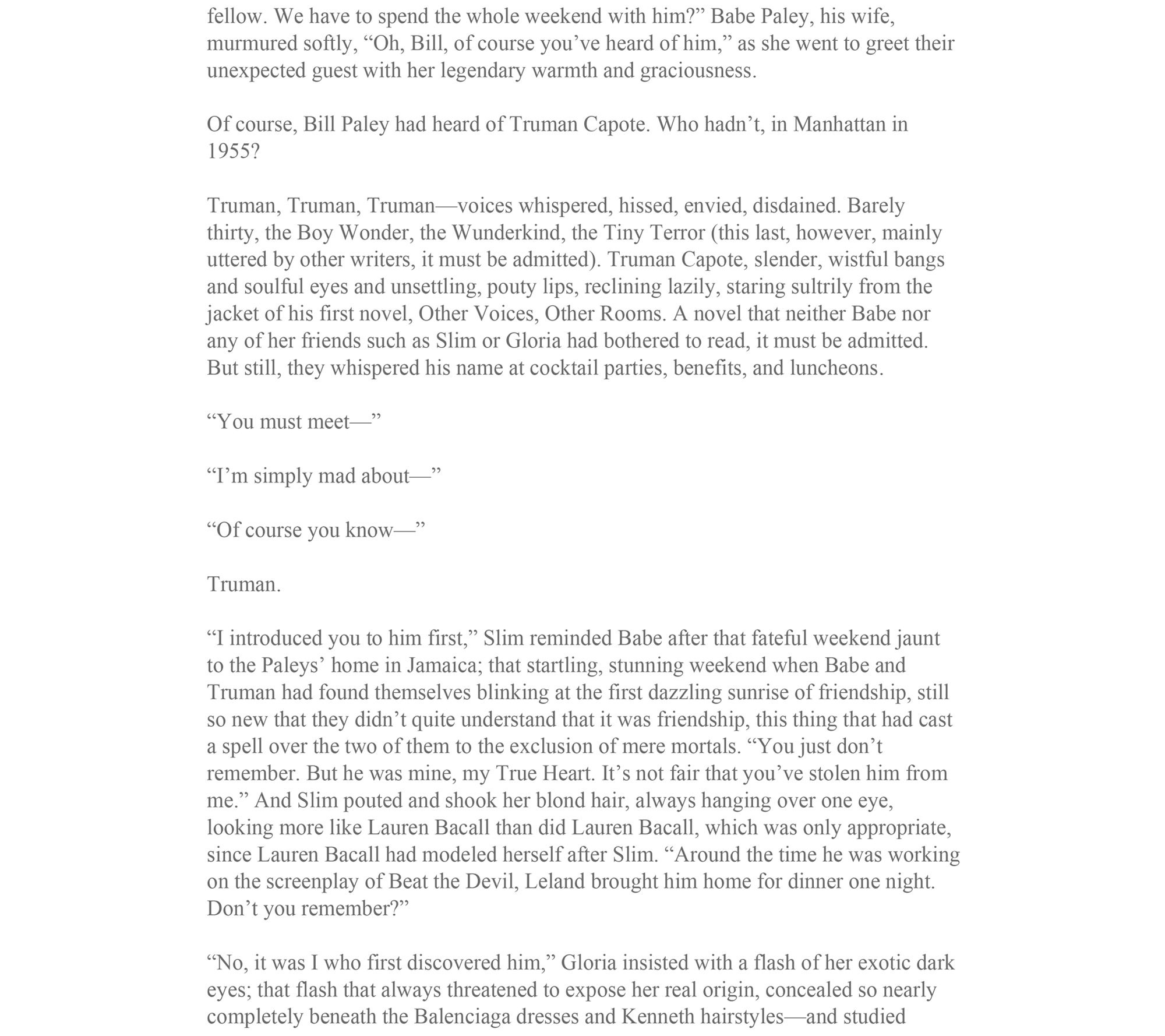 The intriguing story of the 1950s New York's "Swans" and the scandalous, enthralling friendship between Truman Capote and socialite Babe Paley. By all appearances, Babe has it all, but under her composed exterior dwells a passionate woman longing for true love. Enter Truman Capote, a genius with a larger-than-life personality. Sure of his loyalty, Babe never imagines the destruction Truman will leave in his wake as he ignites a literary scandal with repercussions that echo through the years.